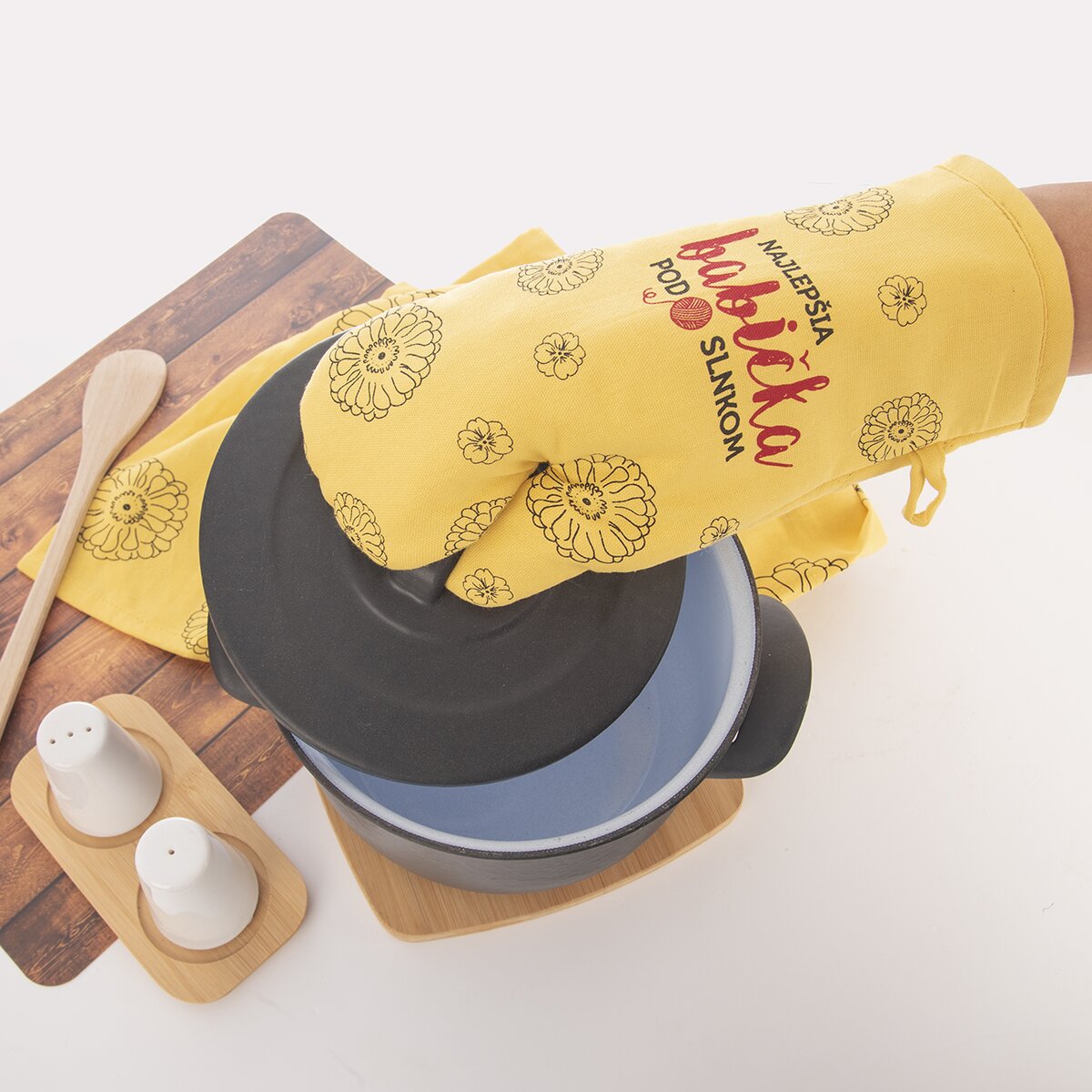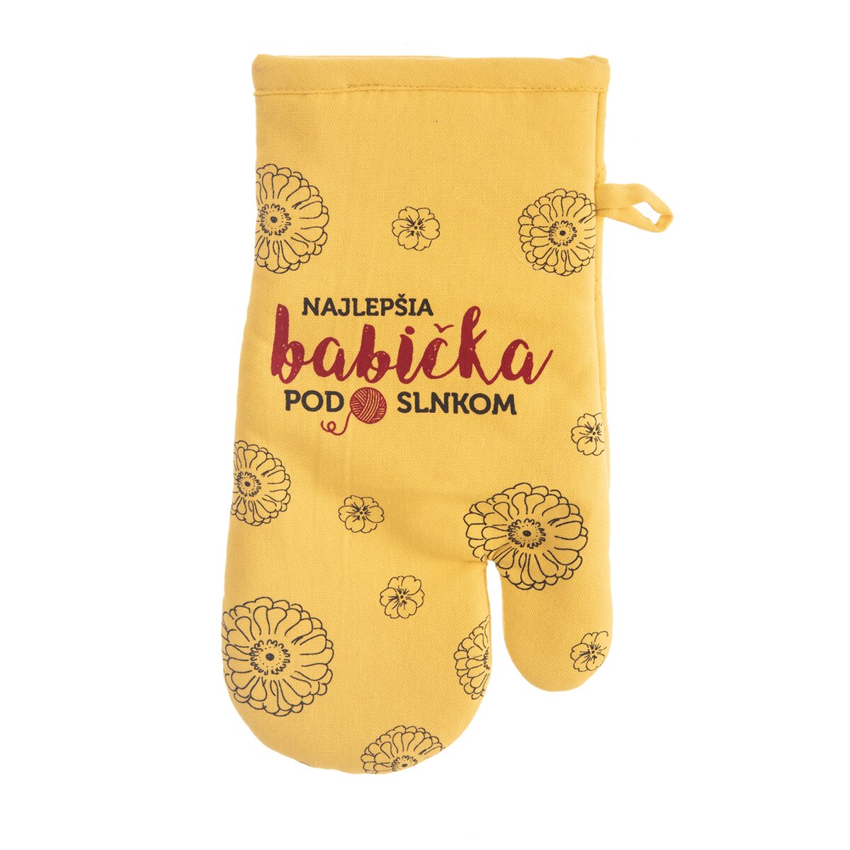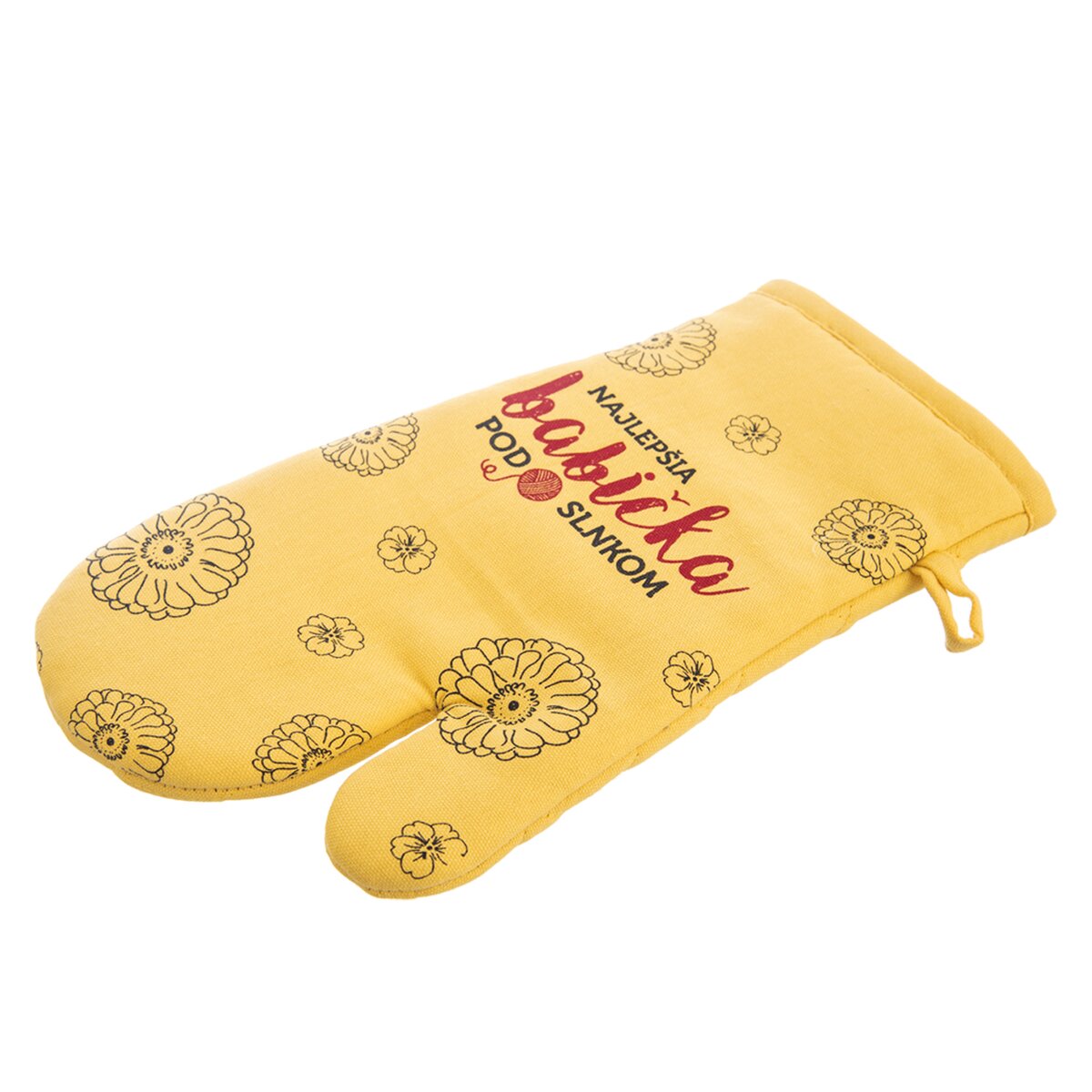 Kód produktu 153908Kuchyňská rukavice ze 100% bavlny ve žluté barvě, s květinovým motivem a nápisem NAJLEPŠIA BABIČKA POD SLNKOM, ochrání ruce při vaření a pečení. Všitý magnet k upevnění na kovové plochy v kuchyni.
