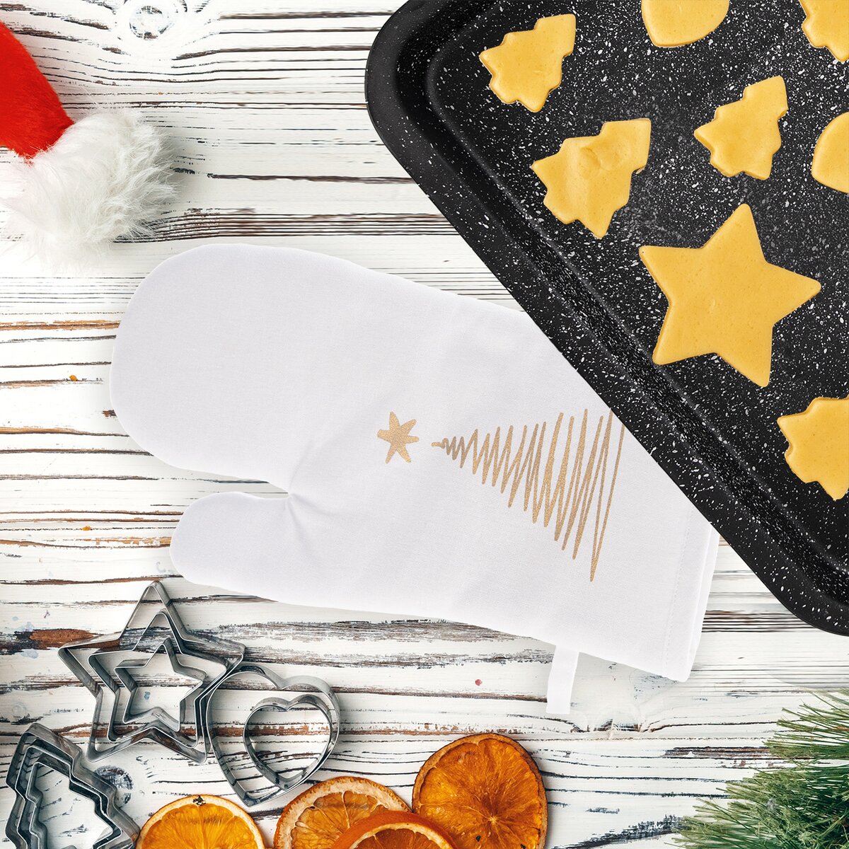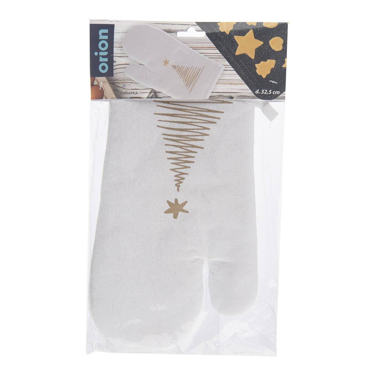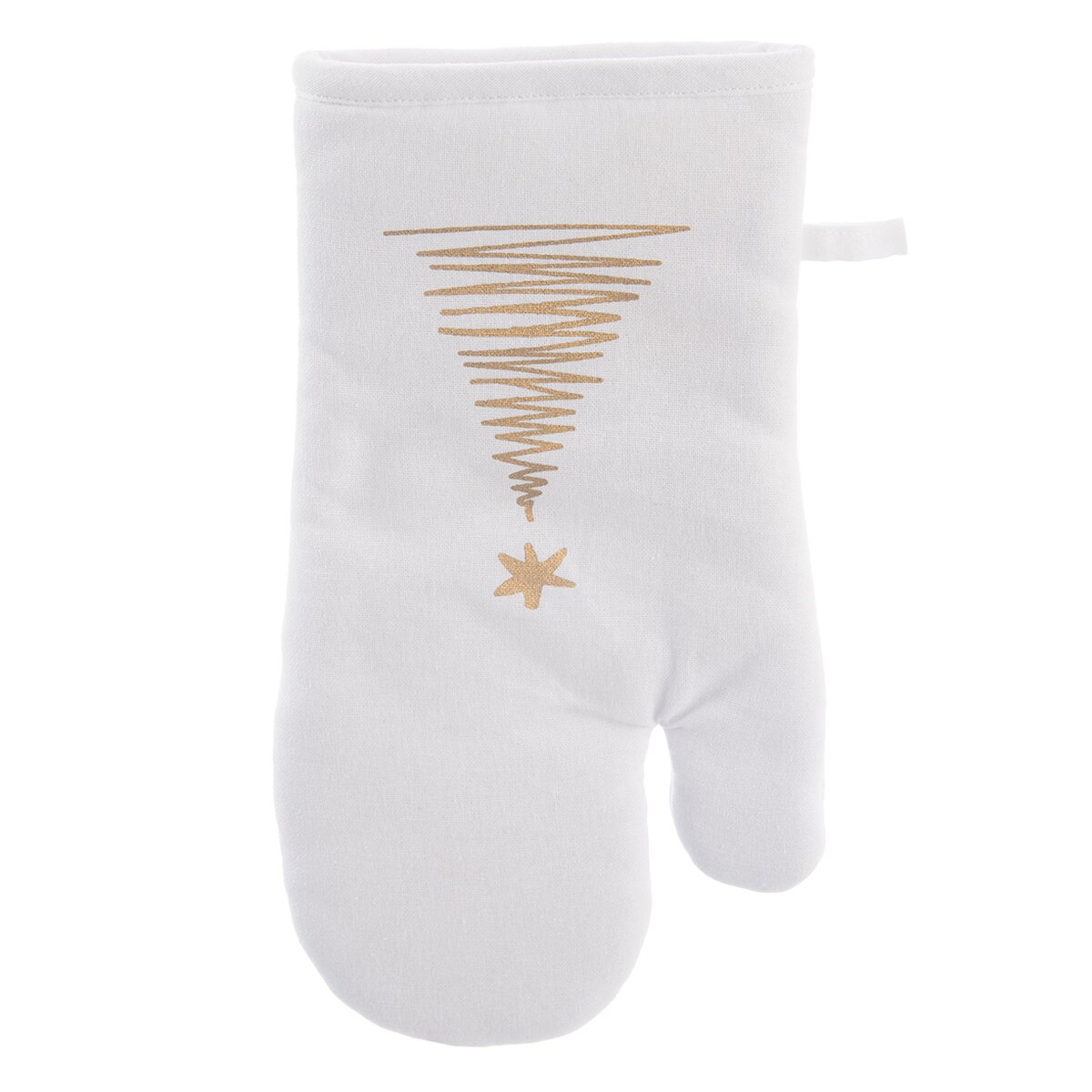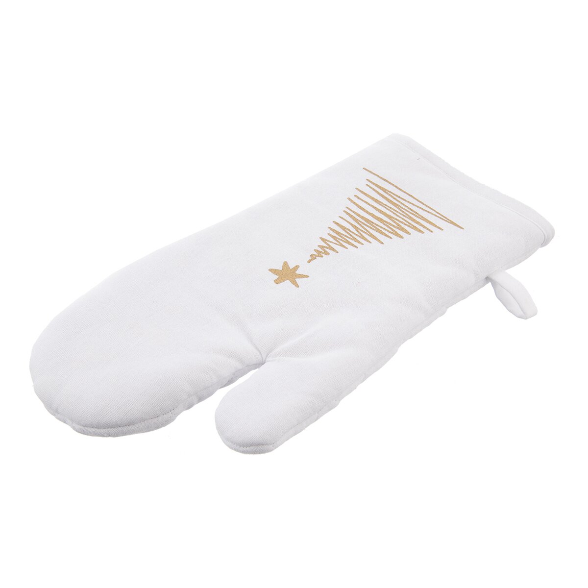 Kód produktu 153915Bílá kuchyňská chňapka ze 100% bavlny je zdobena decentním motivem stromečku ve zlatém odstínu