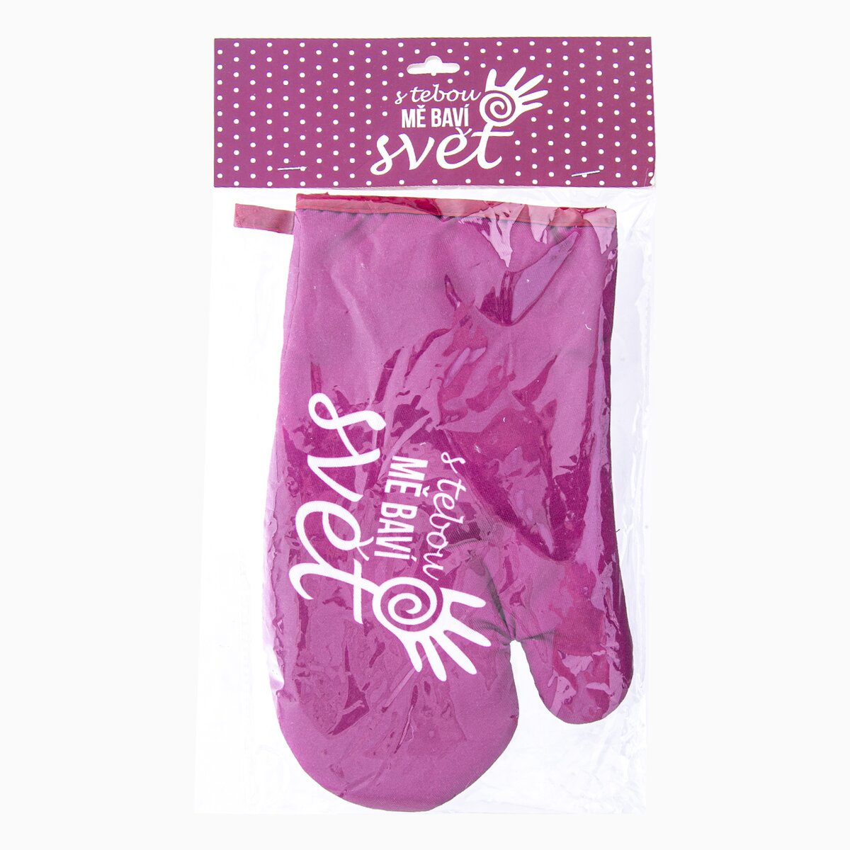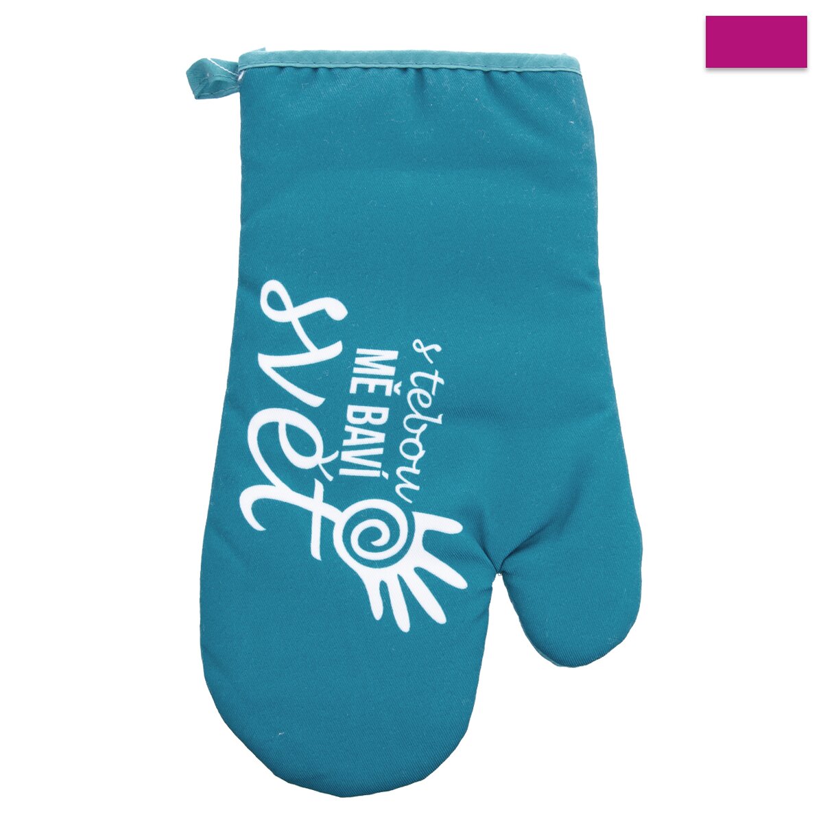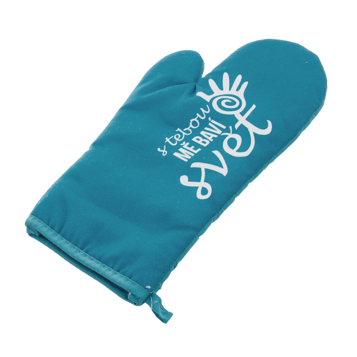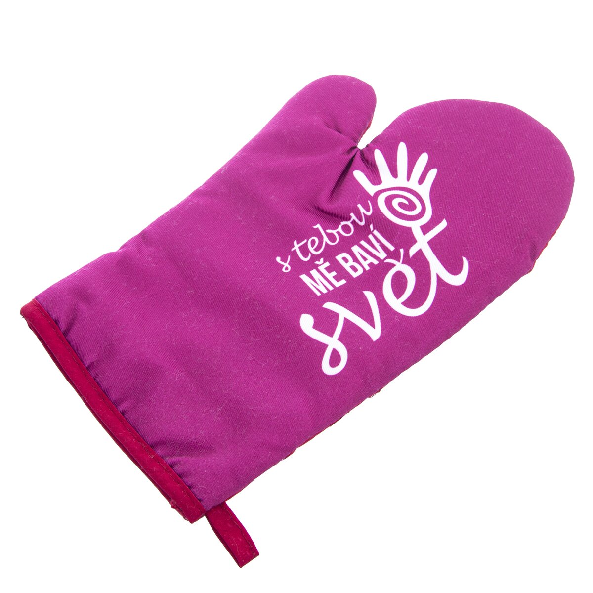 Chňapka kuchyňská s poutkem a s magnetem S TEBOU MĚ BAVÍ SVĚT. Ochrání Vaše ruce při vaření a pečení před popálením. Usnadní manipulaci s horkým nádobím. Možnost zavěšení. Materiál: bavlna/polyester. Rozměry: d. 28 cm, š. 16 cm.