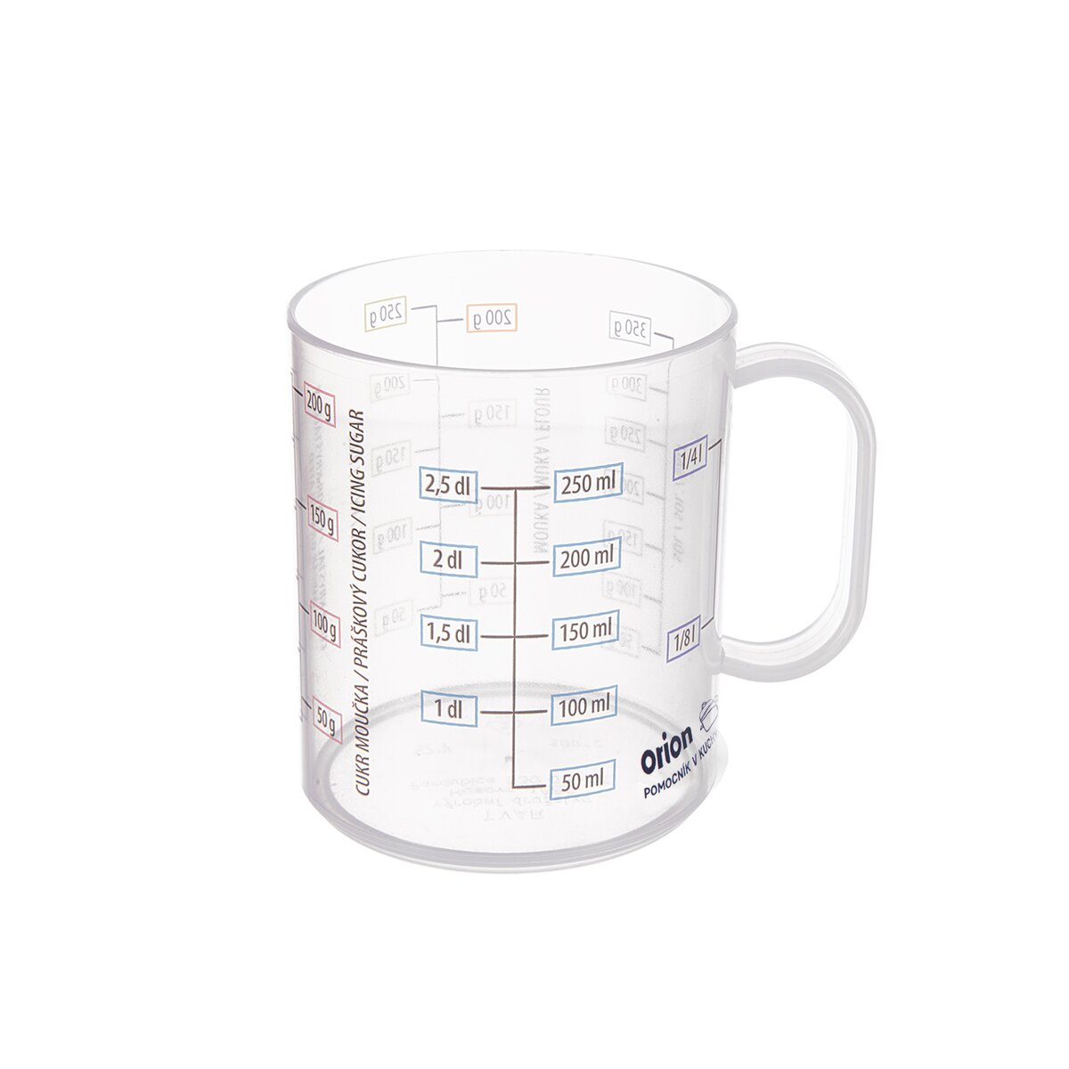 Kód produktu 120558Plastová kuchyňská odměrka o objemu 0,25 l a s uchem je určena k měření množství sypkých i tekutých surovin při vaření či pečení. Odměrná stupnice má značení v ml, dl, l a g pro vybrané potraviny.