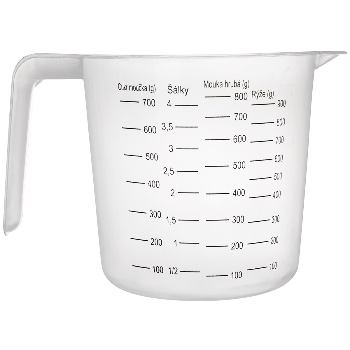 Tato plastová odměrka by neměla chybět v žádné kuchyni. Usnadní vám přípravu složitějších pokrmů a sladkých dezertů. Můžete v ní odměřit jak tekutiny, tak sypké potraviny, jako je mák, cukr, mouka nebo rýže – součástí jsou odměrné stupnice v gramech i mililitrech.