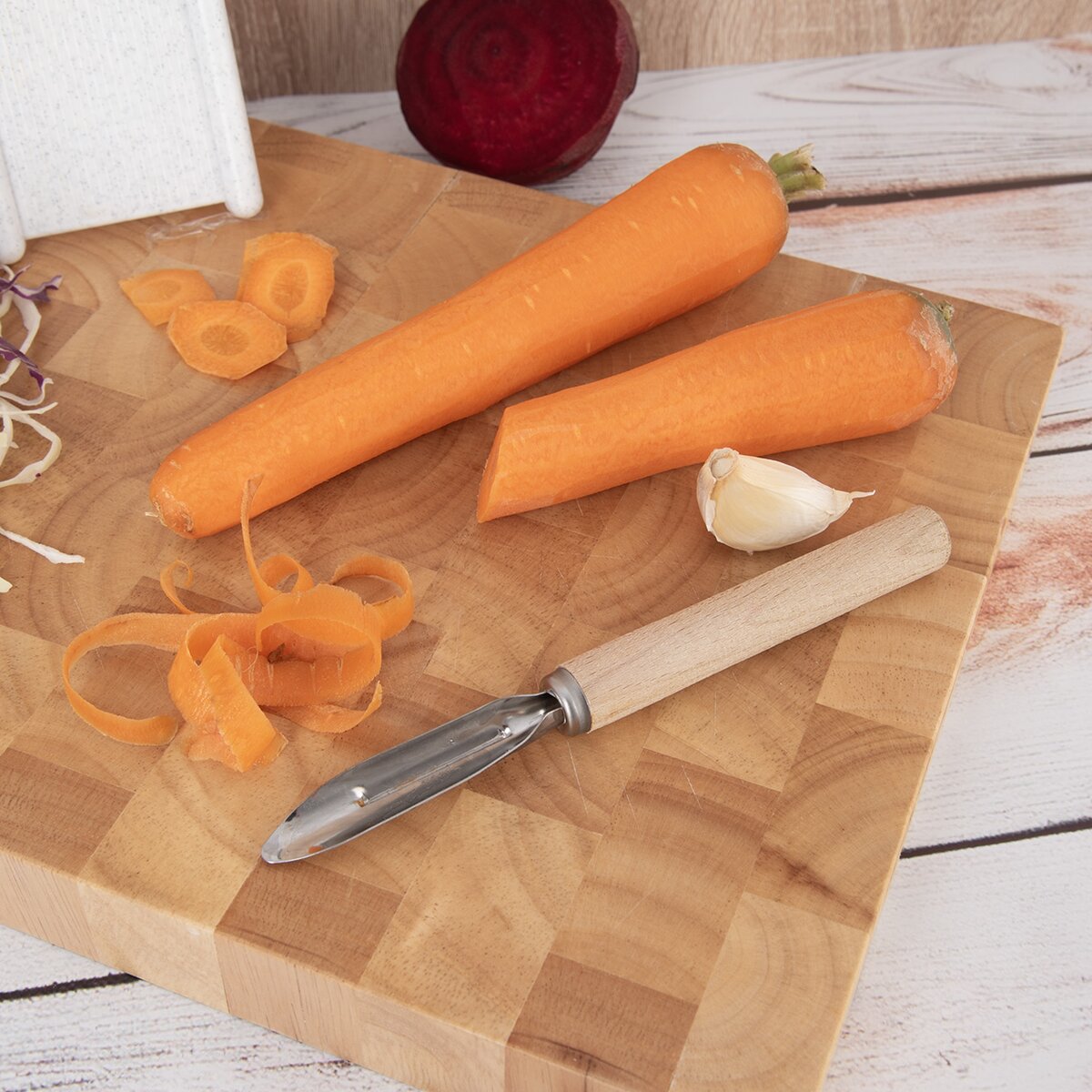 Kód produktu 140701Klasická kovová škrabka na ovoce a zeleninu s dřevěnou rukojetí, určená pro praváky.