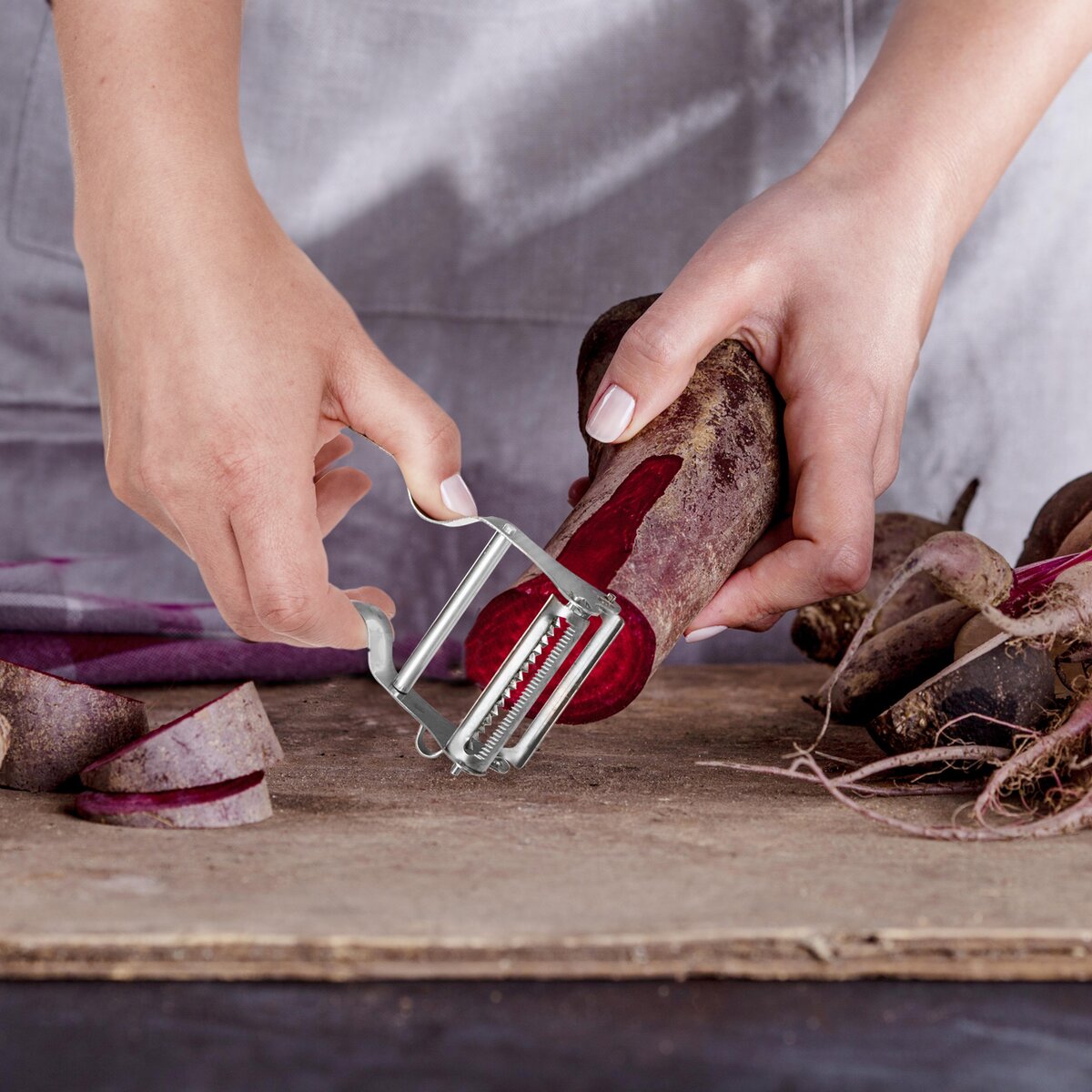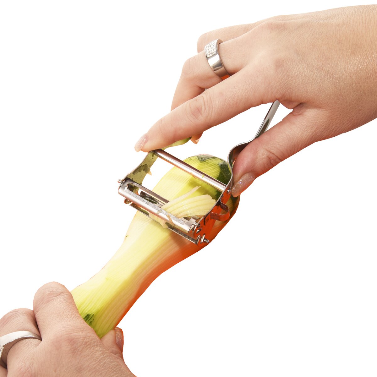 Celonerezová škrabka DOUBLE má hladké ostří, které snadno oškrábe slupku a nakrájí zeleninu či ovoce na tenké plátky. Druhé ostří dokáže velmi lehce nakrájet tenké nudličky zeleniny do polévek nebo salátů, ale i do čínských pokrmů. Zvládne i nudličky z tvrdého sýra.