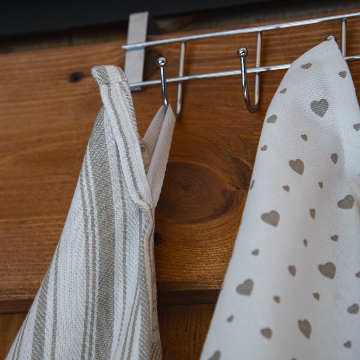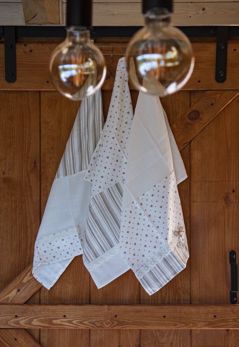 Spojení proužků se vzorem drobných srdíček se hodí nejen na chaty nebo chalupy, ale i do moderní kuchyně. Všechny utěrky jsou navíc opatřeny poutky k zavěšení.