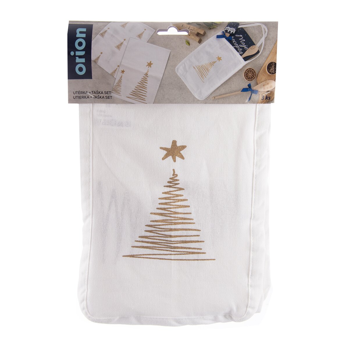 Více informacíSada 2 kusů bílých utěrek a tašky je vyrobena ze 100% bavlny a zdobí ji motiv stromečků ve zlatém odstínu. Jedná se o originální dekor z dílny Orion designérů. Bude praktickým dárkem, který lze využít v domácnosti při utírání nádobí či vytahování horkého nádobí z trouby. Utěrky lze použít i jako menší ubrus, napron doprostřed stolu.