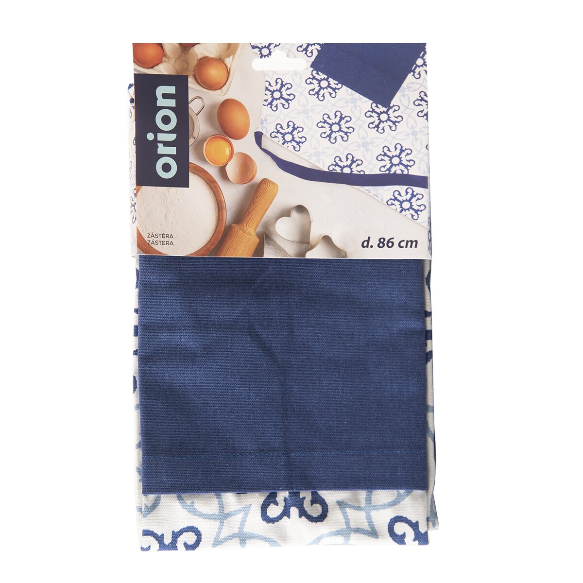 Kód produktu 960367Bavlněná kuchyňská zástěra s modrými ornamenty, kapsou a nastavitelným vázáním kolem krku.