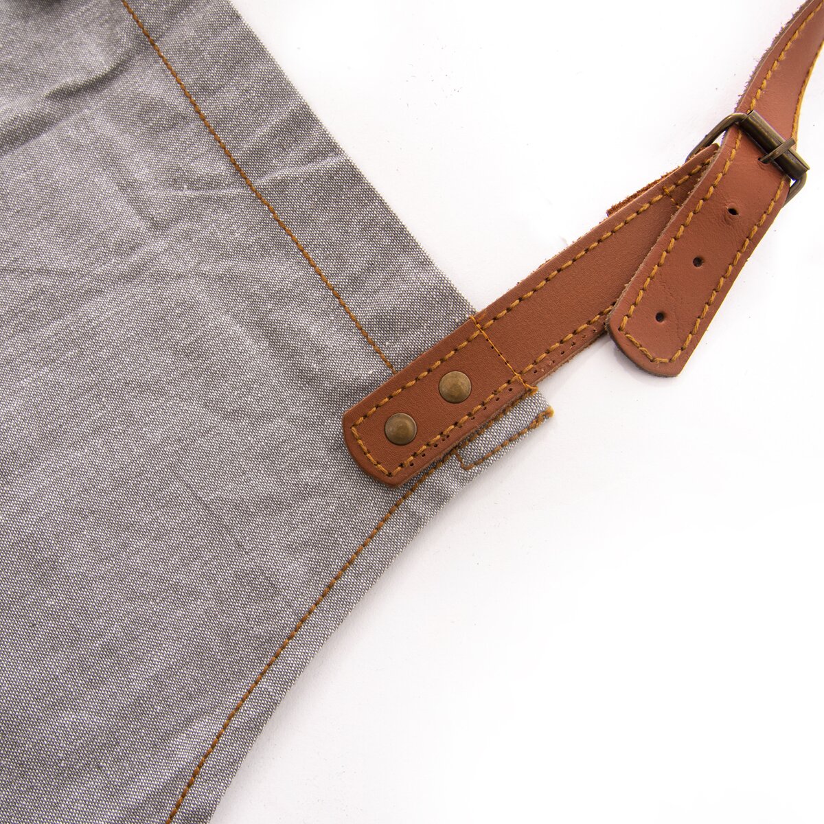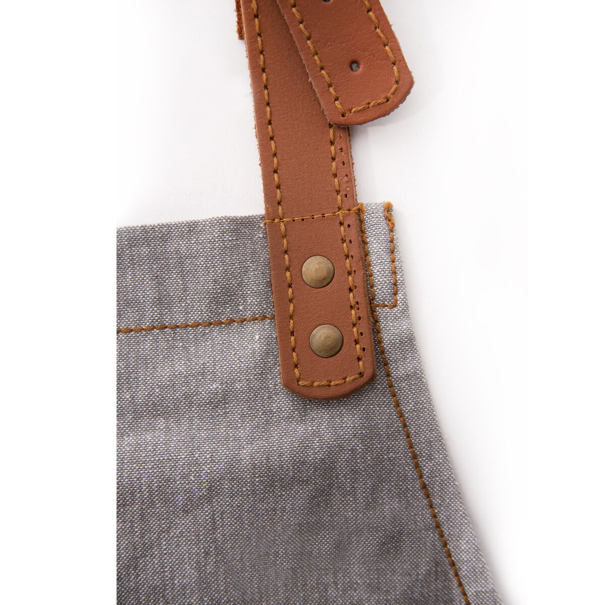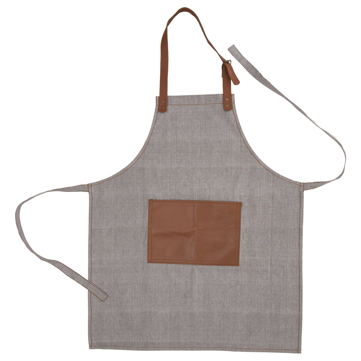 Kód produktu 960370Bavlněná kuchyňská zástěra s koženými detaily, kapsou a nastavitelnou přezkou kolem krku.