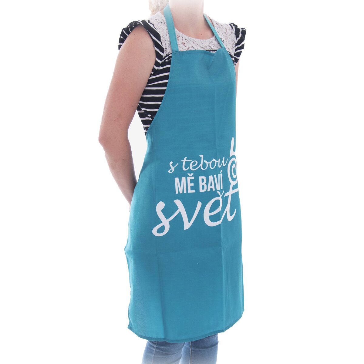 Kód produktu 960378Kuchyňská zástěra s nápisem S TEBOU MĚ BAVÍ SVĚT v petrolejové barvě.