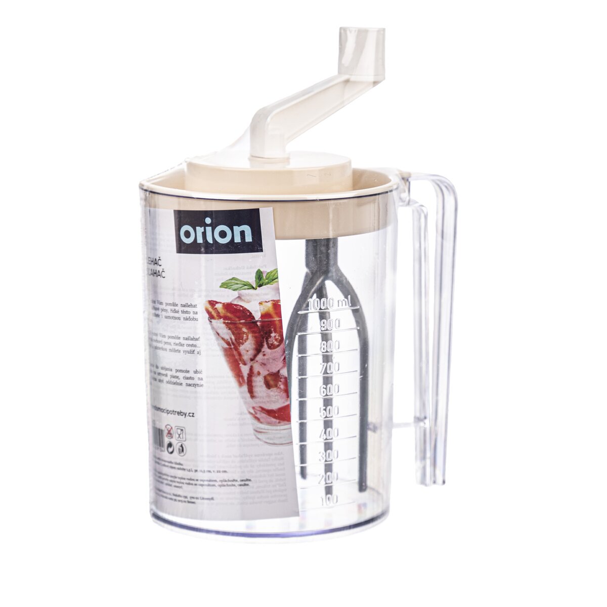 Kód produktu 130602Ruční kuchyňský šlehač z plastu o objemu 1,5 l, s měrnou stupnicí až do 1000 ml a šlehacími metlami z eloxovaného hliníku.