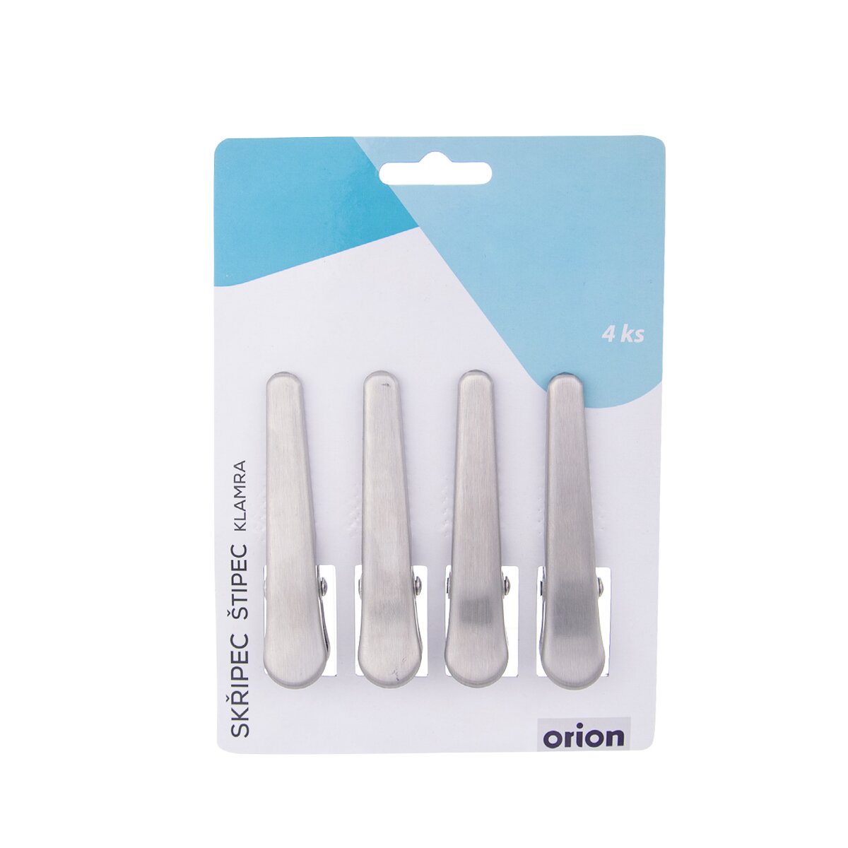 Kód produktu 532077Skřipec - klip na pevné uzavření sáčků - potraviny v nich neosychají, nepřebírají pachy a chutě z jiných uložených potravin, nerozsypou se. Sada 4 kusů, Materiál: nerez. Rozměry: d. 8 cm.