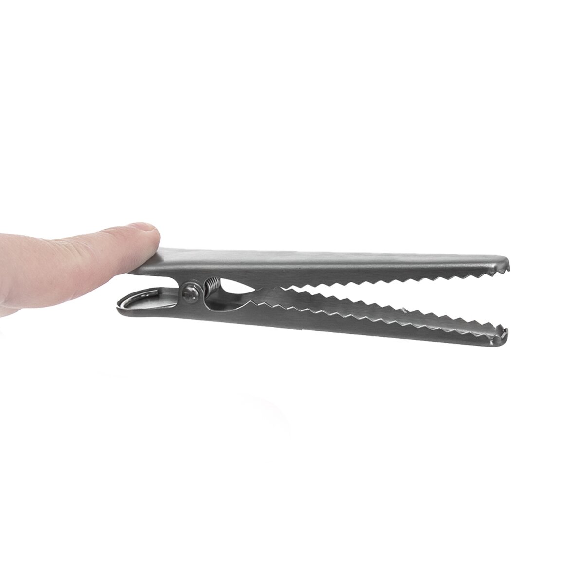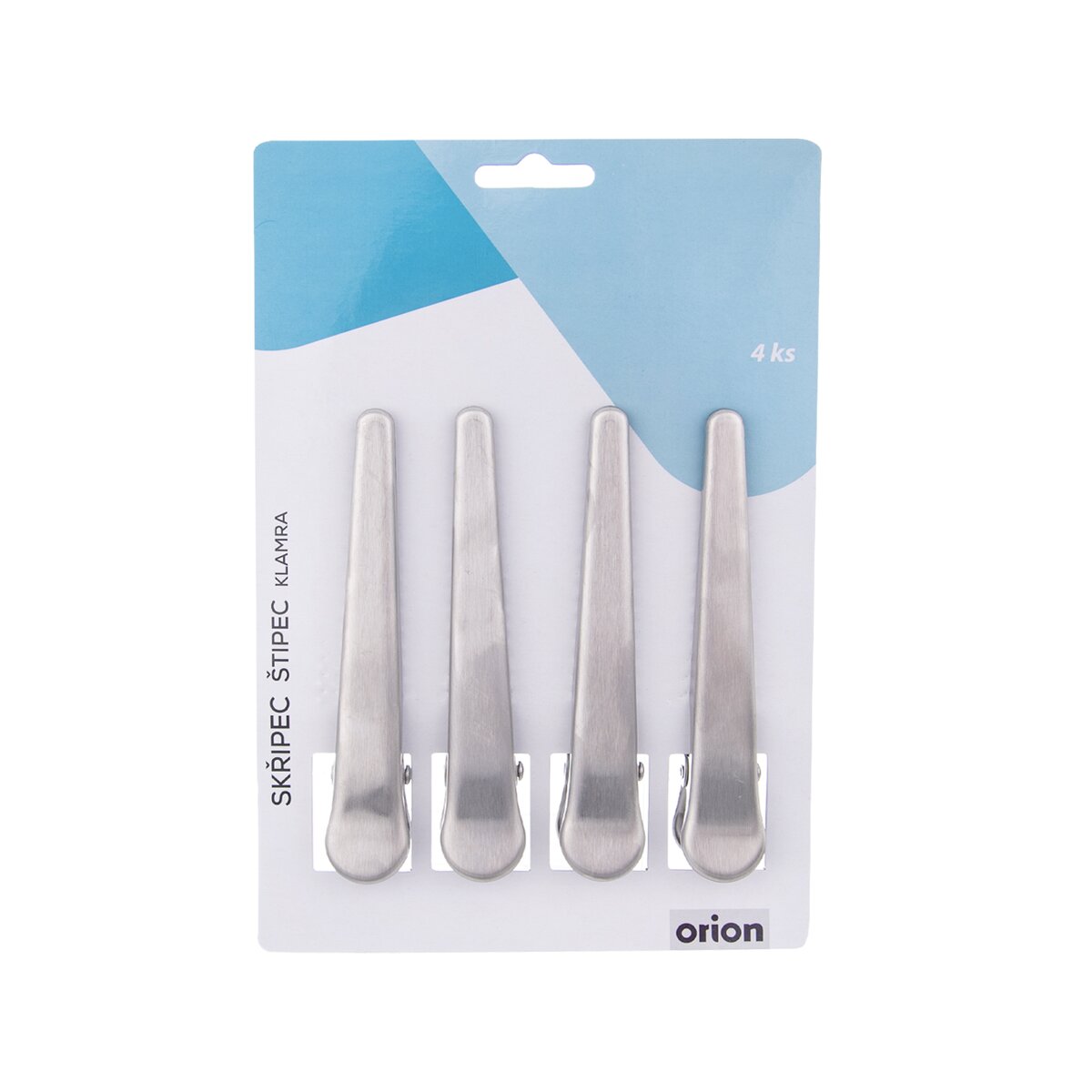 Skřipec - klip na pevné uzavření sáčků - potraviny v nich neosychají, nepřebírají pachy a chutě z jiných uložených potravin, nerozsypou se. Sada 4 kusů, Materiál: nerez. Rozměry: d. 11,5 cm.