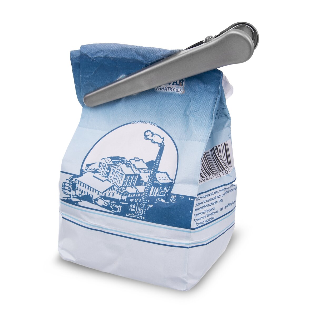 Kód produktu 532078Skřipec - klip na pevné uzavření sáčků - potraviny v nich neosychají, nepřebírají pachy a chutě z jiných uložených potravin, nerozsypou se. Sada 4 kusů, Materiál: nerez. Rozměry: d. 11,5 cm.