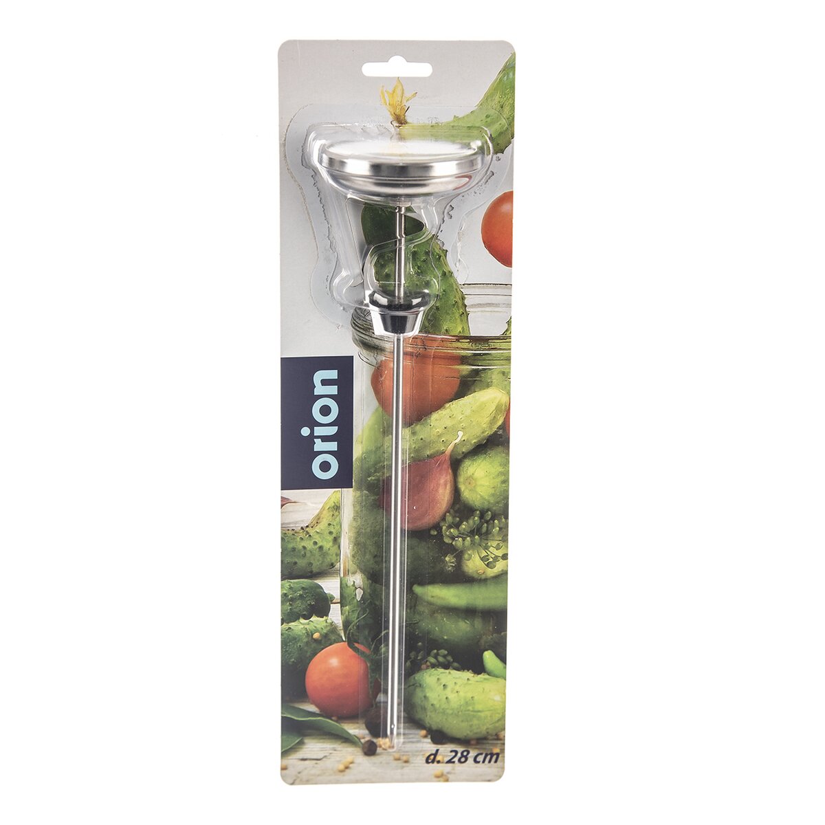 Kód produktu 152862Nerezový teploměr na zavařování s průměrem ciferníku 7,5 cm a celkovou délkou 28 cm. Součástí je gumová zarážka k upevnění do poklice a klip k připevnění na okraj hrnce.