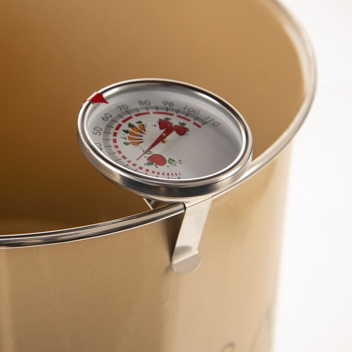Ciferník je ozdobený ovocem poukazujícím na teplotu potřebnou k jeho zavaření. Posuvná červená šipka na okraji teploměru umožňuje označení požadované teploty. Součástí balení je gumová zarážka, která slouží k upevnění teploměru do středového otvoru na poklici hrnce. Druhou možností je jeho připevnění na okraj hrnce pomocí přiloženého klipu.