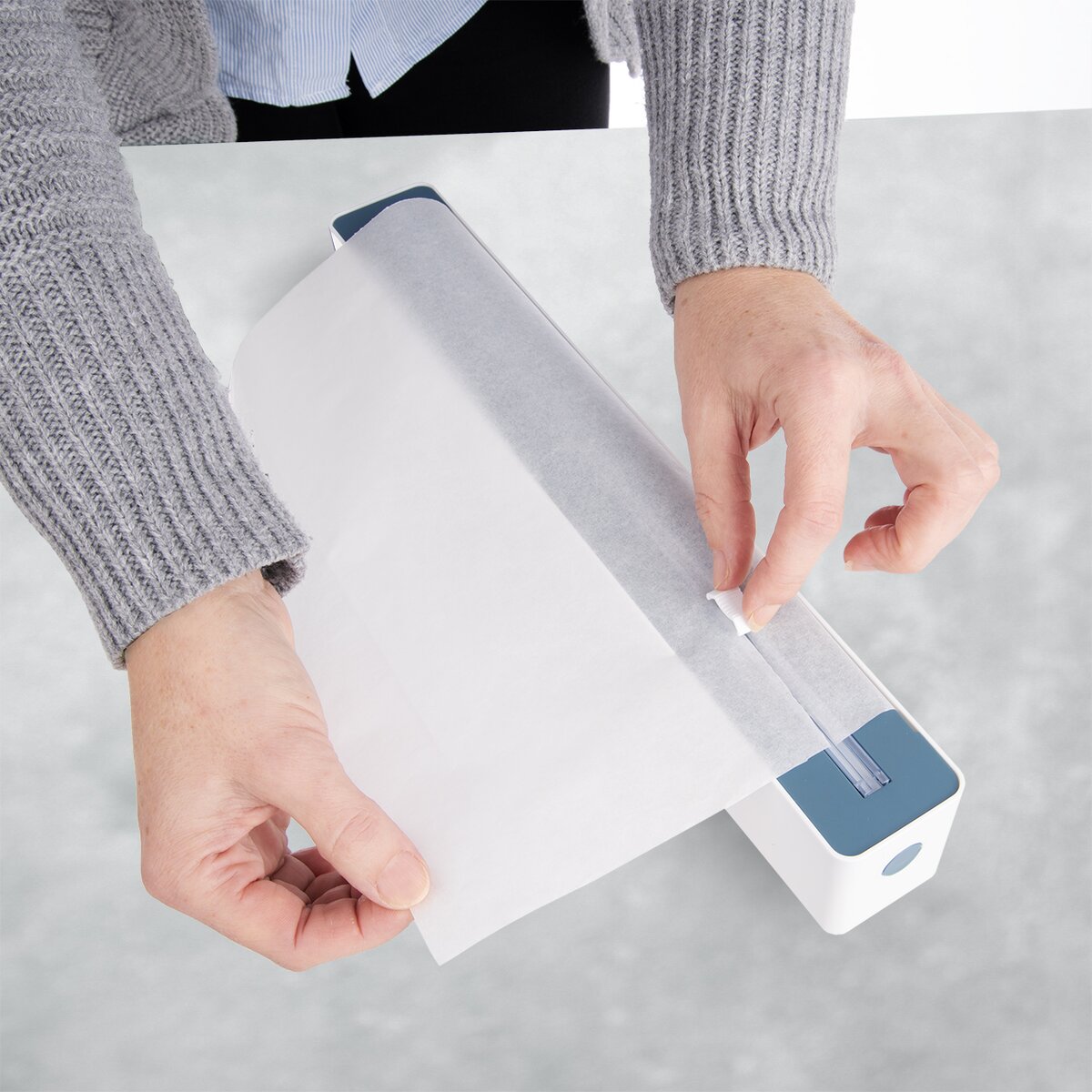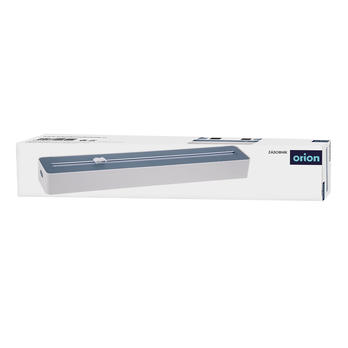 Kód produktu 154063Plastový zásobník s horní modrou částí je opatřen lištou s řezákem a otvorem, skrz nějž lze prostrčit alobal, pečicí papír nebo potravinářskou fólii a dle potřeby odříznout. Lze jej připevnit přísavkami na hladkou stěnu nebo uložit do zásuvky.