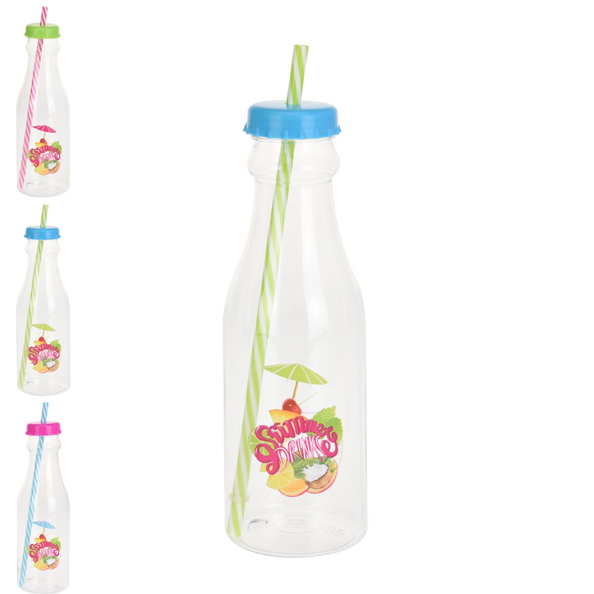 Láhev na míchané drinky s víčkem a brčkem - ať už na alkoholické nápoje nebo bez alkoholu, s ovocem, ledem,... Materiál: plast. Assort barev. Rozměry: objem 0,65 l, pr. 7 cm, v. 23/26 cm.