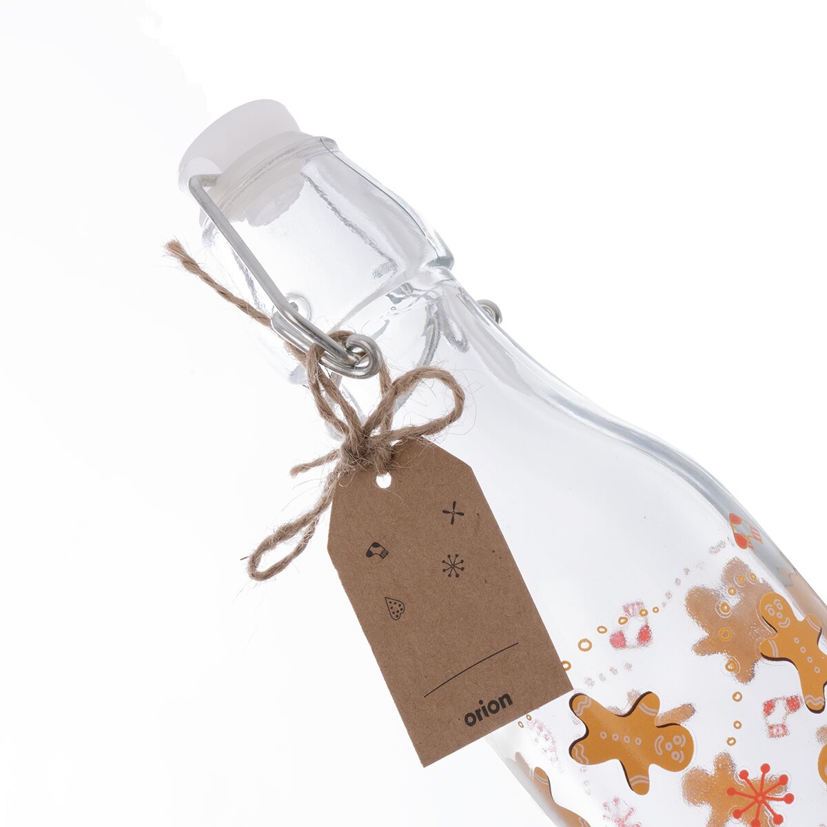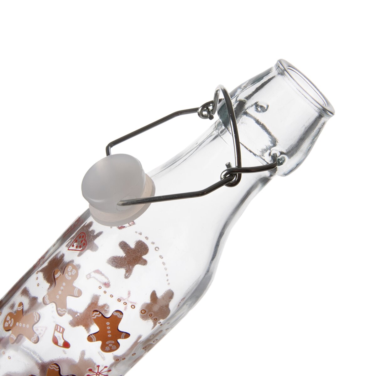Menší láhev s dekorem roztomilých perníčků je ideální na slivovičku, vaječný likér, sirup, šťávu a jiné nápoje. Je opatřena kovovou přezkou s klipovým uzavíráním.