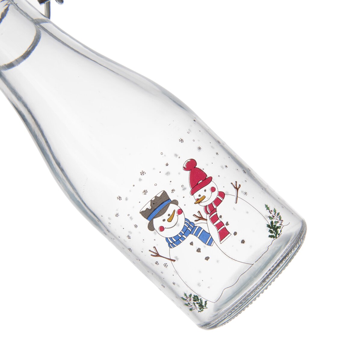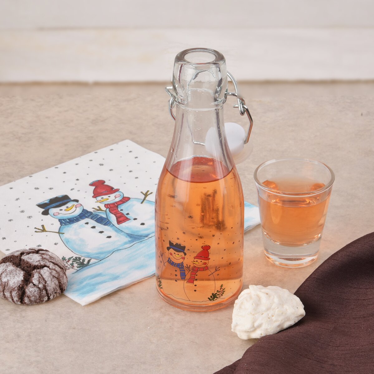 Menší lahvička s dekorem roztomilých sněhuláků je ideální na slivovičku, vaječný likér, sirup, šťávu a jiné nápoje. Je opatřena kovovou přezkou s klipovým uzavíráním.