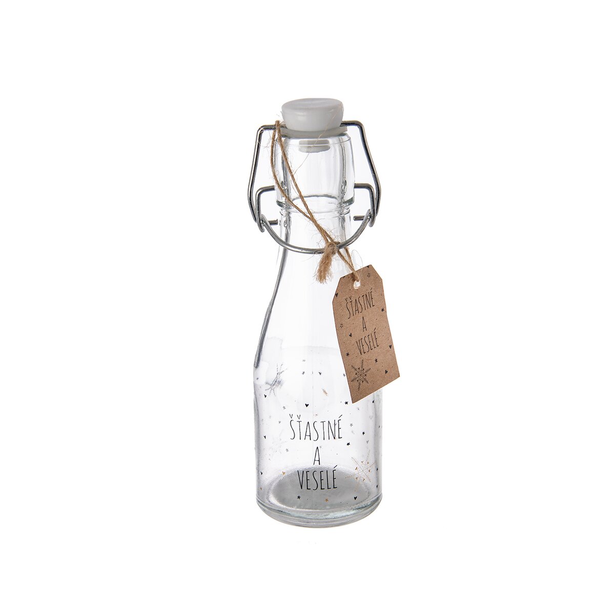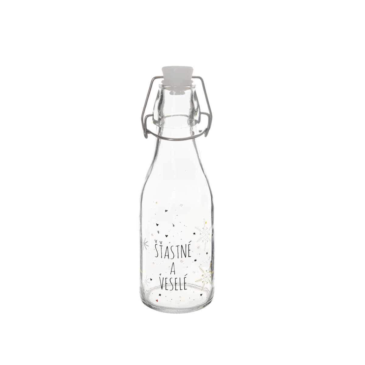Kód produktu 152371Kulatá skleněná láhev VLOČKA o objemu 0,16 l má pákový uzávěr a silikonové těsnění. Zdobí ji dekor bílých a zlatých vloček a nápis ŠŤASTNÉ A VESELÉ. Je ideální k uložení nápojů typu vaječný koňak, punč, slivovice nebo domácího sirupu.
