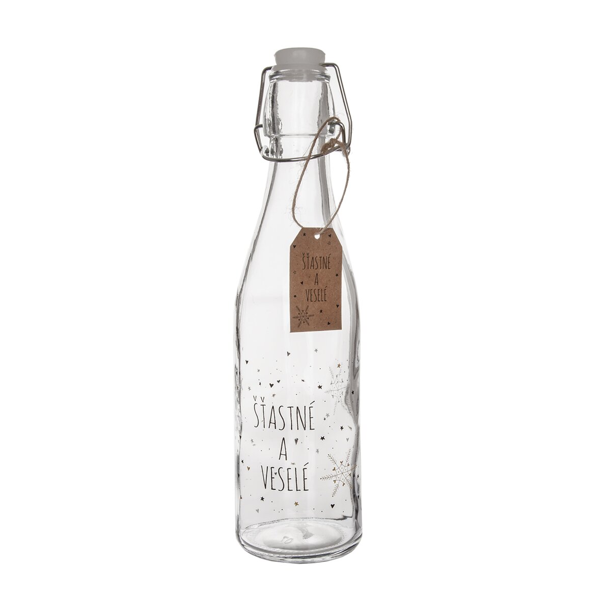 Kód produktu 152375Kulatá skleněná láhev VLOČKA o objemu 0,52 l má pákový uzávěr a silikonové těsnění. Zdobí ji dekor bílých a zlatých vloček a nápis ŠŤASTNÉ A VESELÉ. Je ideální k uložení nápojů typu vaječný koňak, punč, slivovice nebo domácího sirupu.