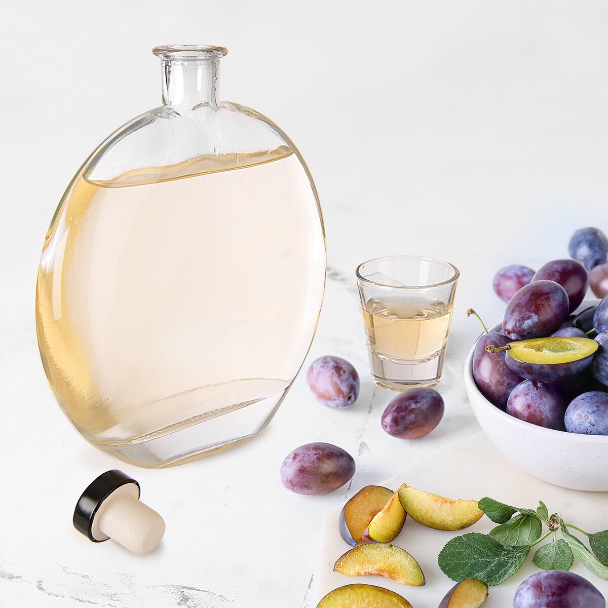 Oblá skleněná láhev je ideální k uložení domácí pálenky, např. slivovičky z Moravy nebo ořechovky. Hodí se na různé druhy pálenek, lihovin, ale i domácího sirupu.