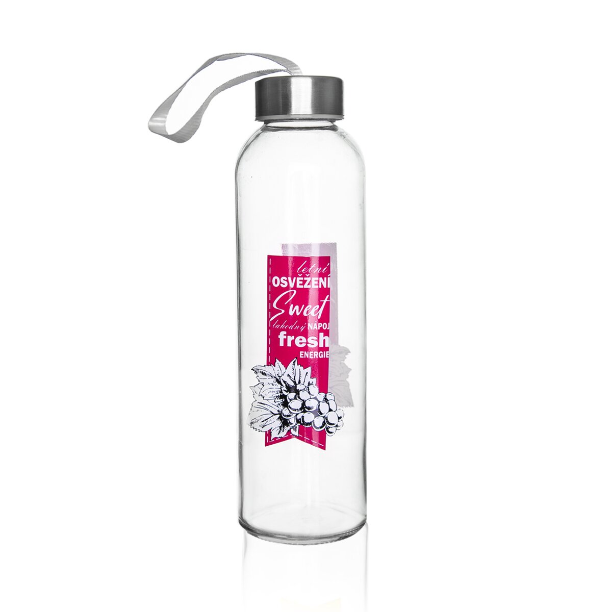 Kód produktu 125999Skleněná láhev FRESH o objemu 0,55 l s barevným dekorem a kovovým víčkem na závit.