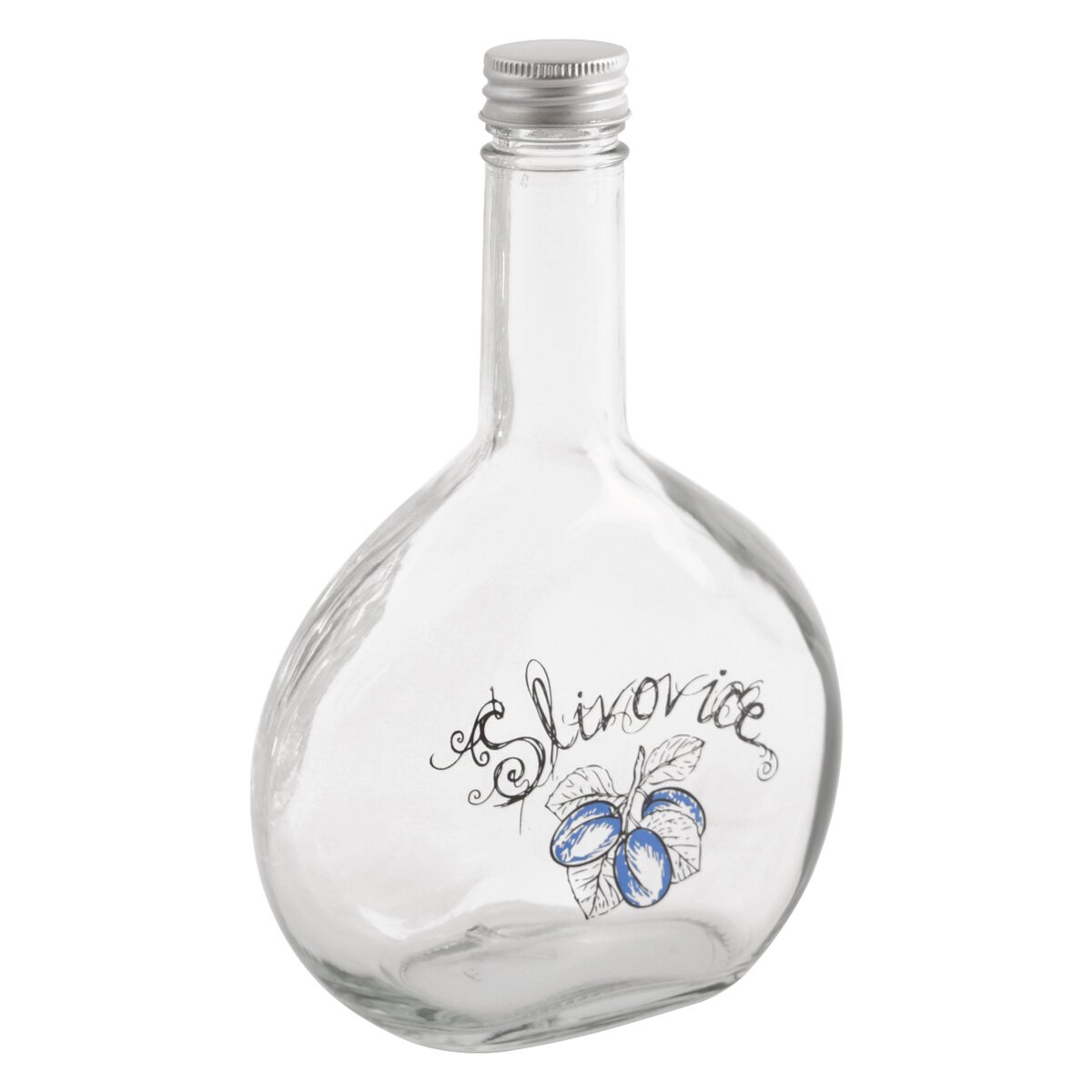 Kód produktu 610695Skleněná zaoblená láhev o objemu 0,5 l s víčkem na závit a dekorem SLIVOVICE.