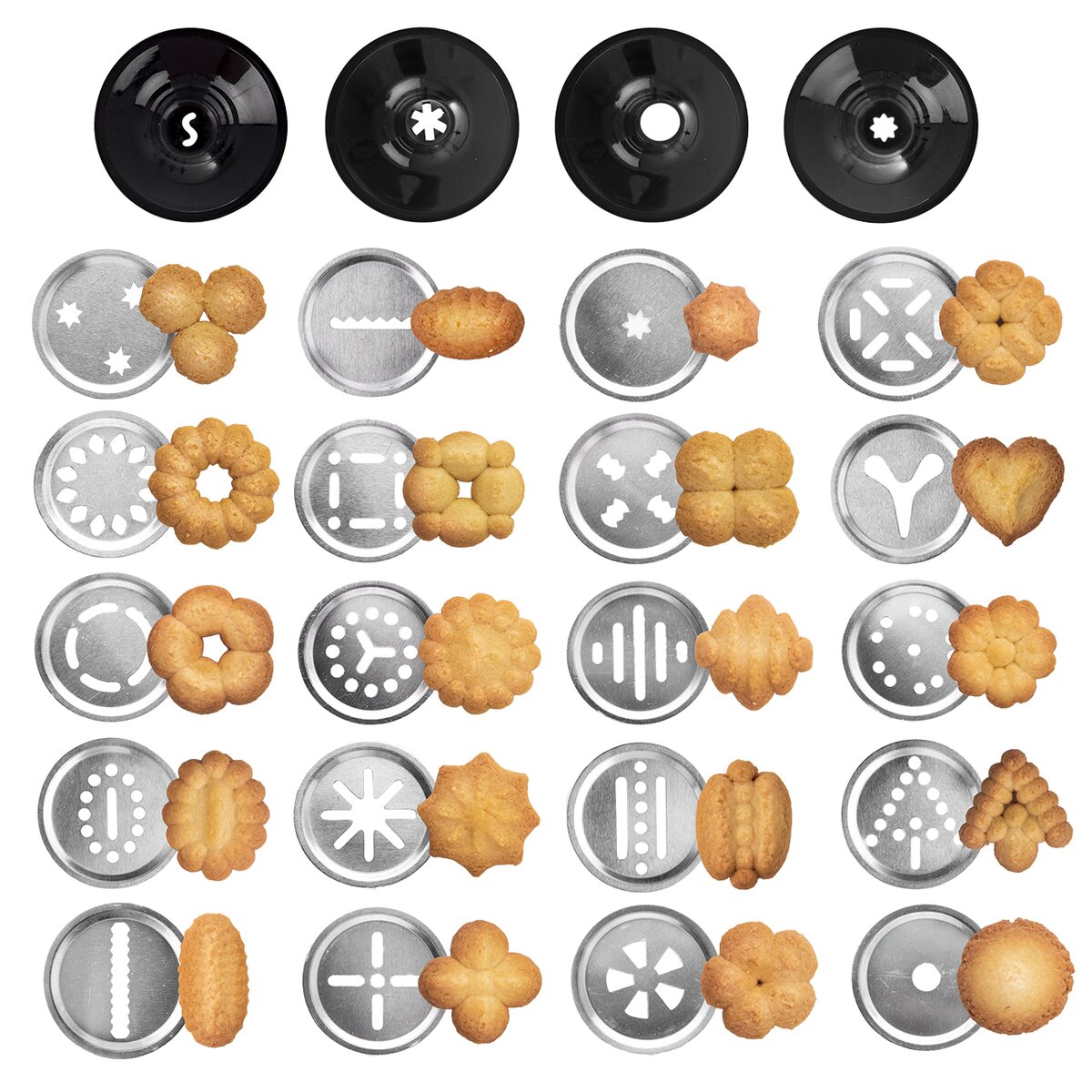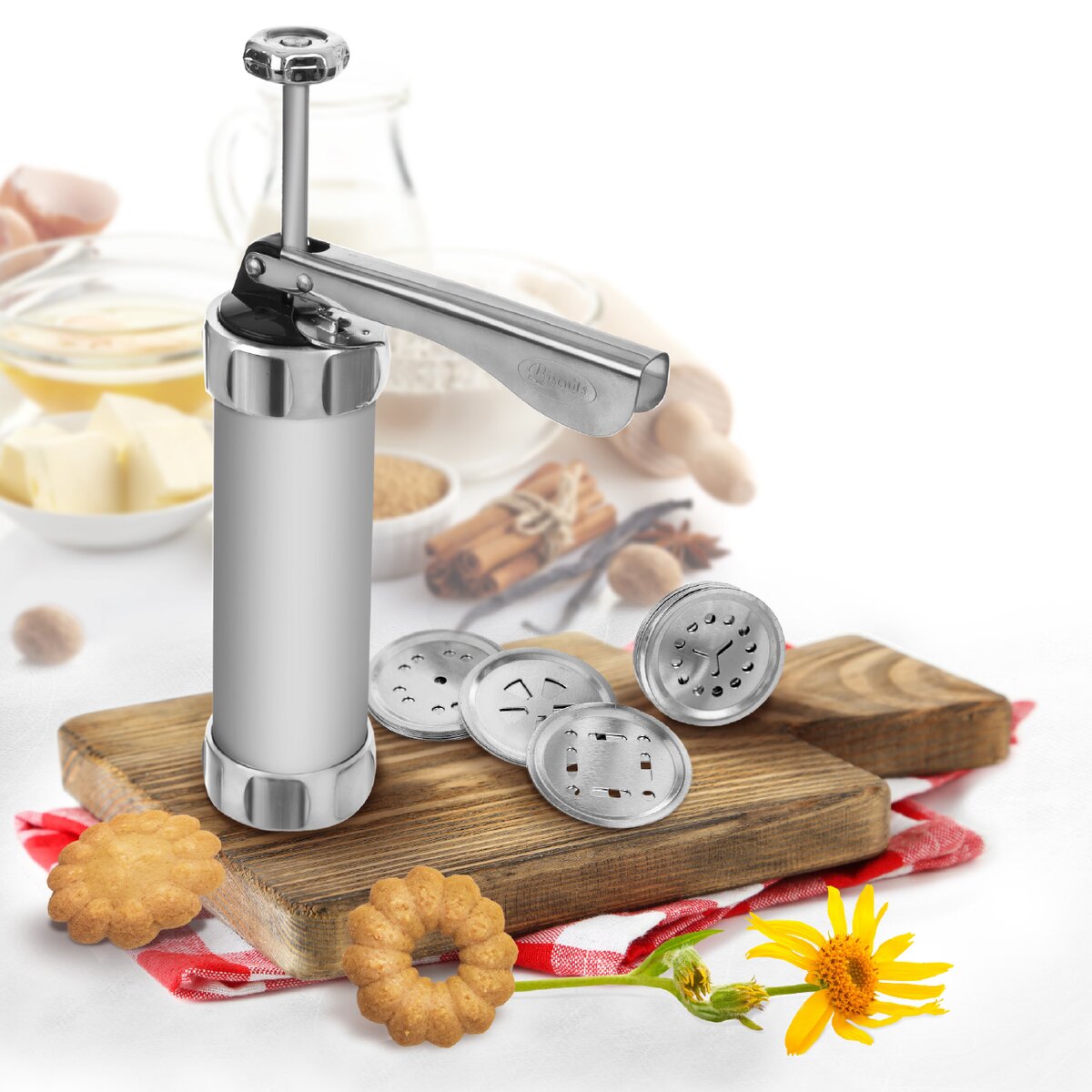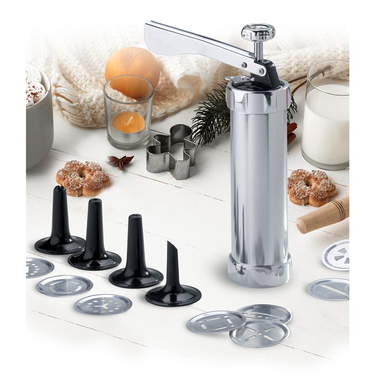 Kód produktu 141743Kovový mechanický lis na přípravu křehkých máslových sušenek. Jeho součástí je i 20 ks nástavců na různé tvary sušenek a 4 plastové zdobicí nástavce ke zdobení dortů, dezertů i chlebíčků.