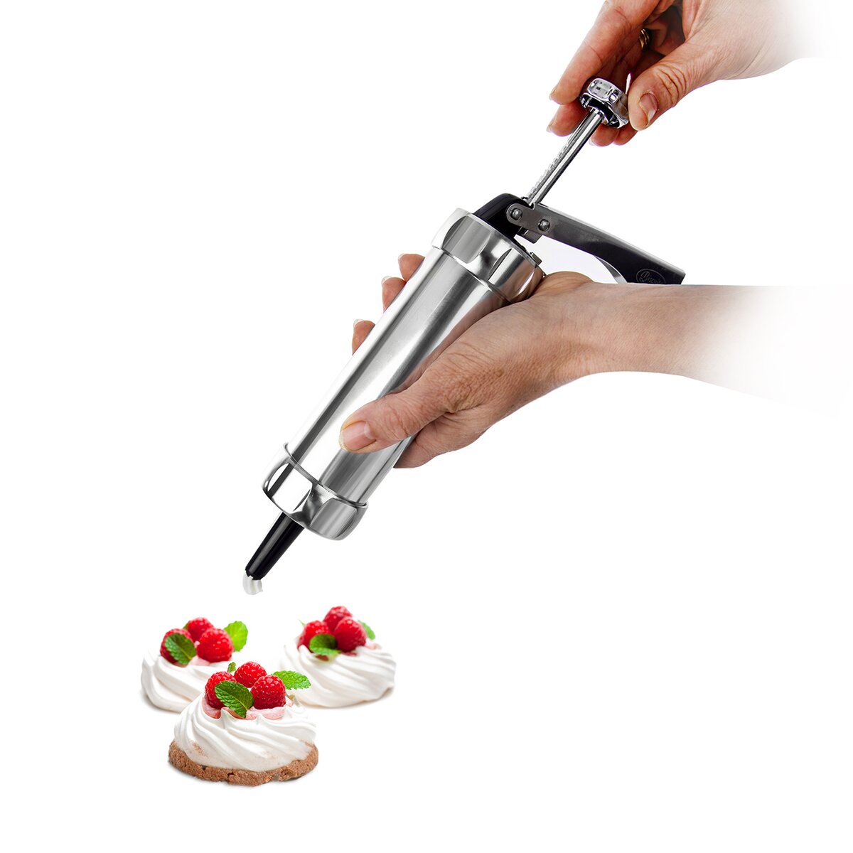 A při zdobení dortů, sladkých dezertů šlehačkou, krémem nebo obložených chlebíčků pikantními pomazánkami, lze využít plastové nástavce. Po použití jej stačí umýt běžným způsobem.