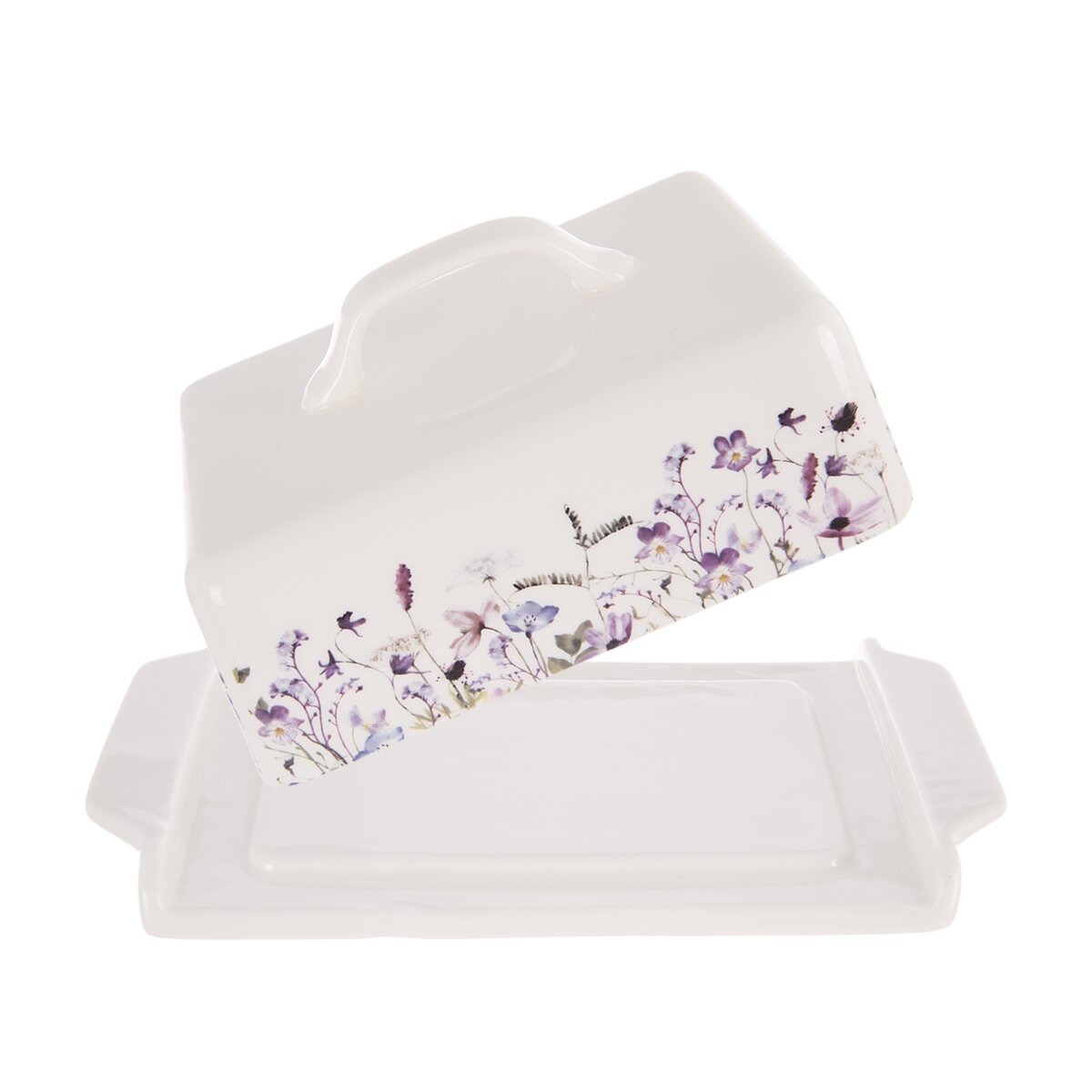 Nepraktické umaštěné obaly od másla, které se navíc při krájení často proříznou, nahradí jednoduše praktická bílá porcelánová máslenka s úchytem a spodní samostatnou částí, na kterou lze kostku másla položit. Navíc je zdobena něžným dekorem lučních květin v modrých a fialových odstínech.