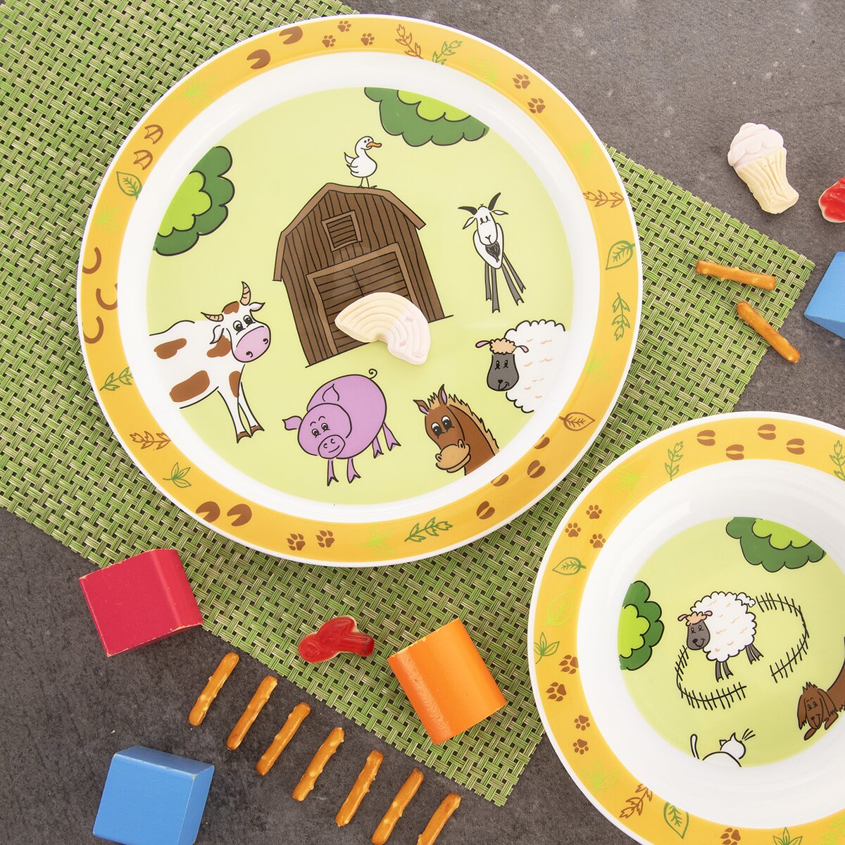Rohlík se šunkou, řízek s bramborovou kaší nebo nakrájené ovoce můžete dětem servírovat na mělkém talířku s roztomilým motivem na téma farma. Vydejte se na dobrodružství se zvířátky z farmy a můžete si s vaším malým nezbedou u snídaně či oběda povídat o tom, co se dělá na statku, farmě. A můžete si zazpívat i známou písničku "Starý farmář farmu měl...".