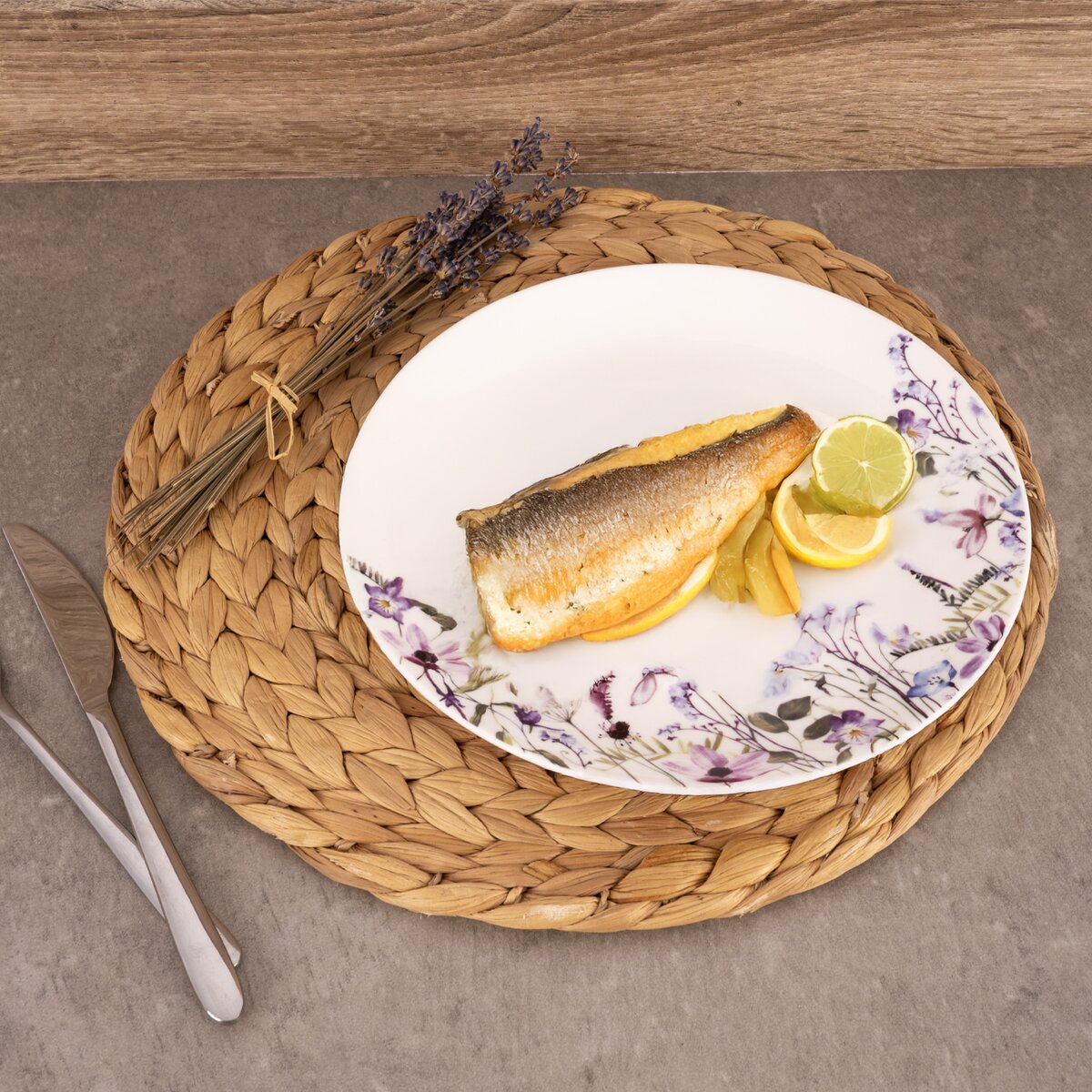 Kód produktu 129181Porcelánový mělký talíř z kolekce LOUKA má průměr 24 cm a je zdoben něžným dekorem lučních květin.