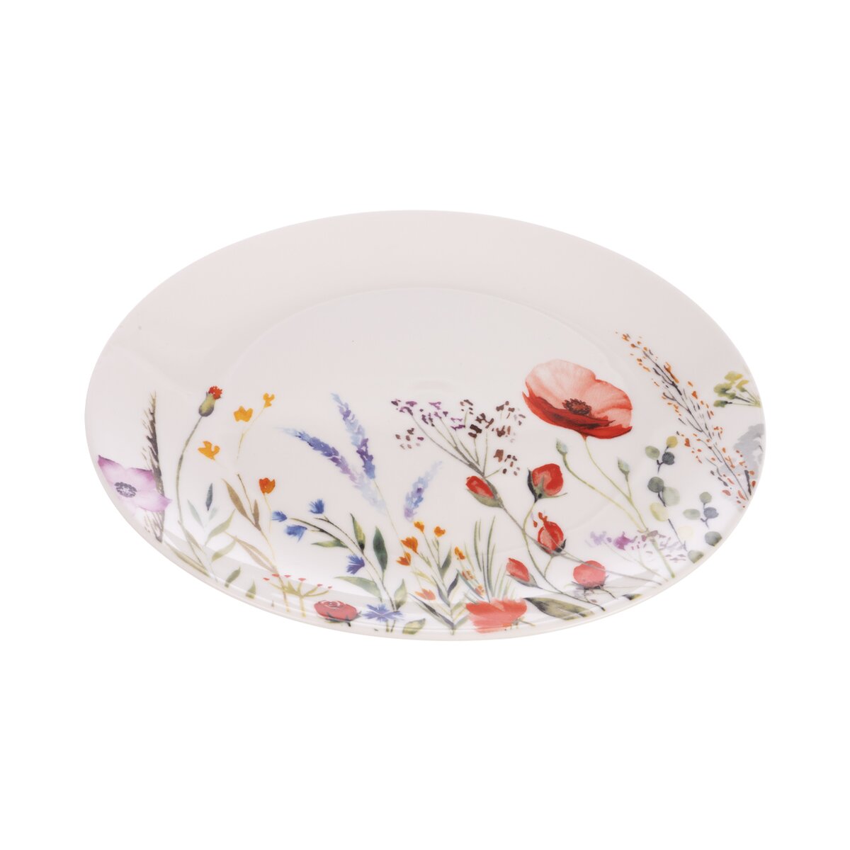 Kód produktu 129180Porcelánový mělký talíř z kolekce MÁK má průměr 24 cm a je zdoben něžným dekorem lučních květin.