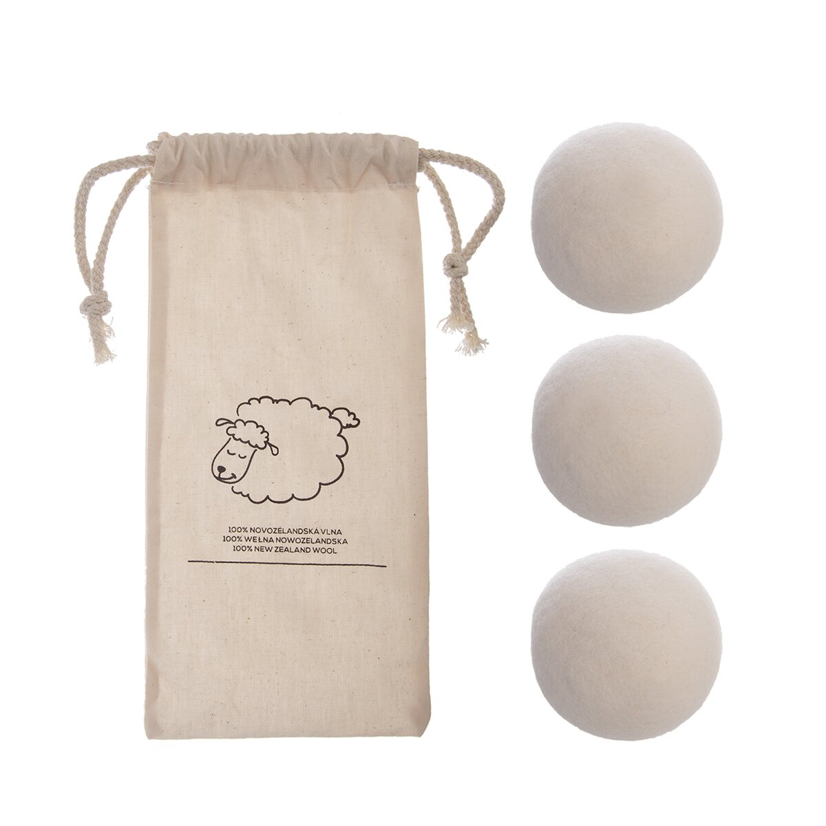 Kód produktu 531719Opakovaně použitelné míčky z ovčí vlny jsou v sadě 3 kusů uloženy v bavlněném sáčku. Při sušení prádla v sušičce zkracují dobu sušení, změkčují prádlo, pohlcují zbytkovou vlhkost atd.