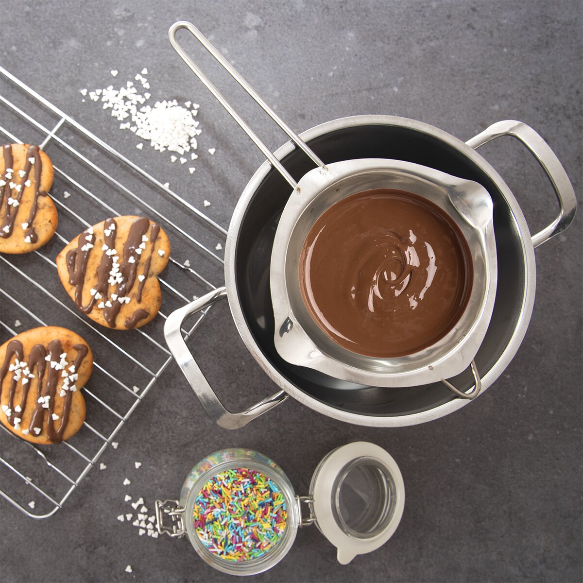 Nezbytná pomůcka pro každého milovníka pečení. Tato nerezová miska usnadní rozpouštění másla, čokolády a vybraných polev ve vodní lázni.