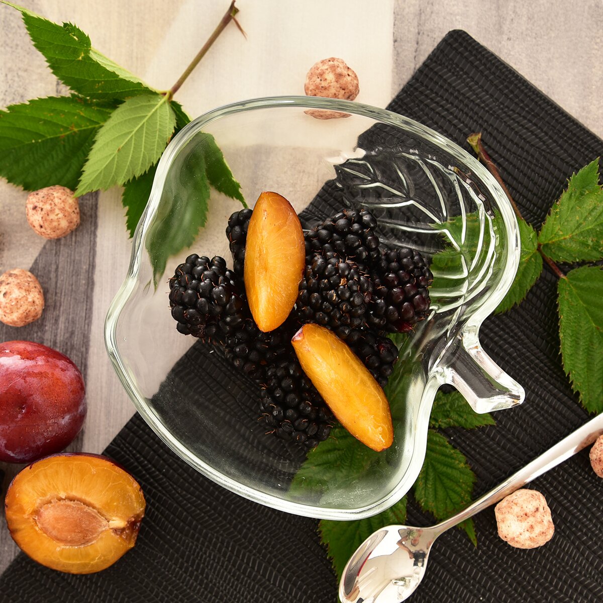 Hodí se nejen k servírování slaných oříšků, oliv nebo menšího ovoce. Také ji můžete využít na sladké dezerty jako jsou tiramisu, panna cotta nebo pudink s ovocem. Kromě neobvyklého tvaru miska zaujme i svým strukturovaným povrchem a plastickým dekorem lístku.
