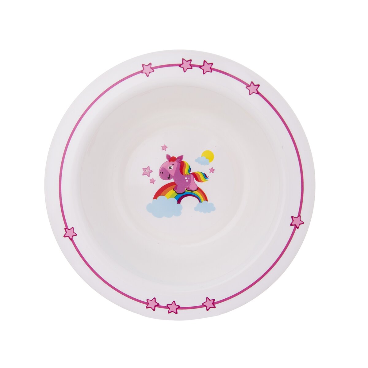 Růžový koník prohánějící se po nebesích. Proč stojí na duze? A kam asi utíká? Tato nebeská miska zaujme pozornost nejednoho malého strávníka. Je vyrobená z kvalitního plastu a má průměr 14 cm.