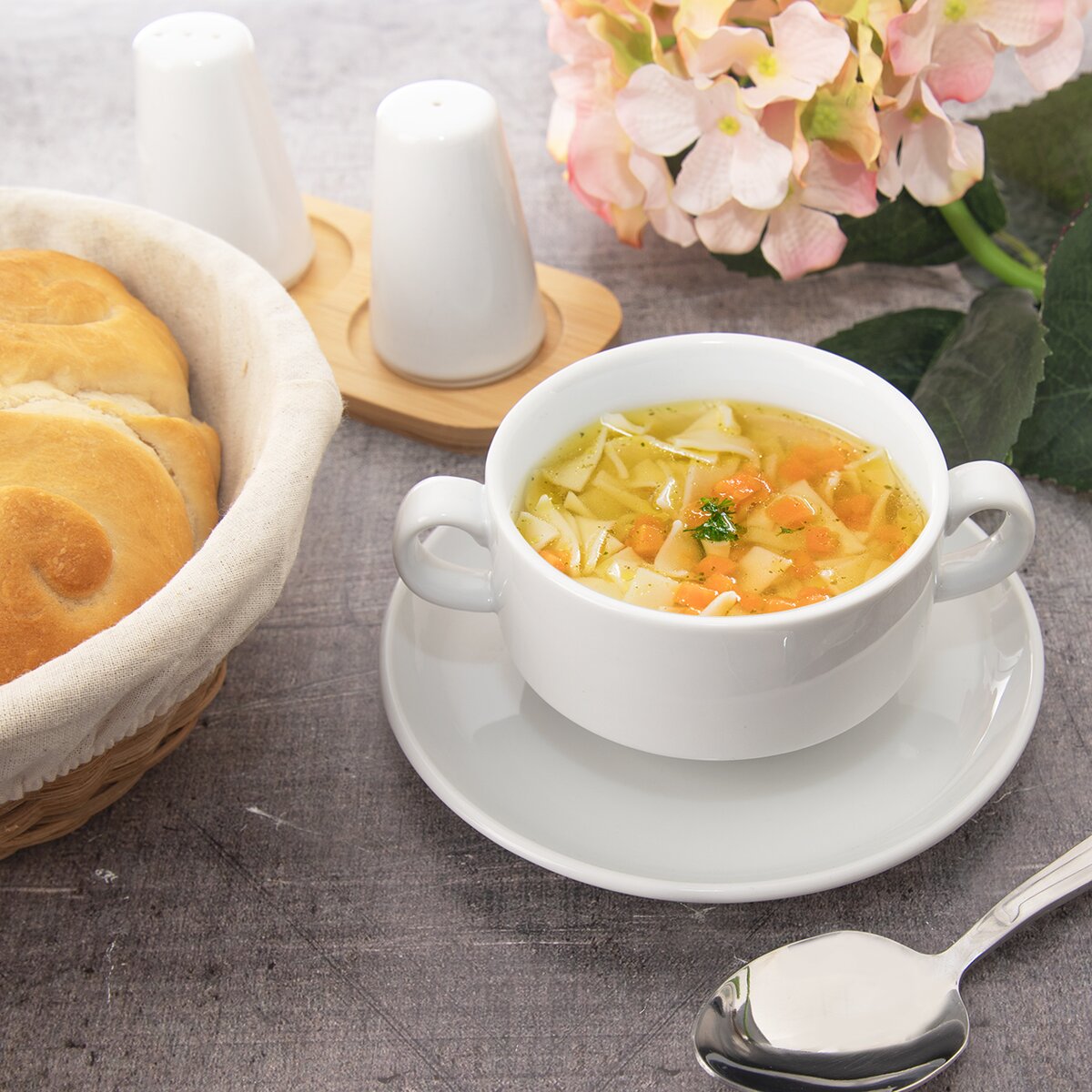 Kód produktu 129842Porcelánová polévková miska o objemu 310 ml, doplněná dvěma uchy, je určena k podávání horkých polévek, ale i zdravých snídaní a svačiny s müsli, ovoce, jogurtu i zeleninových salátů.