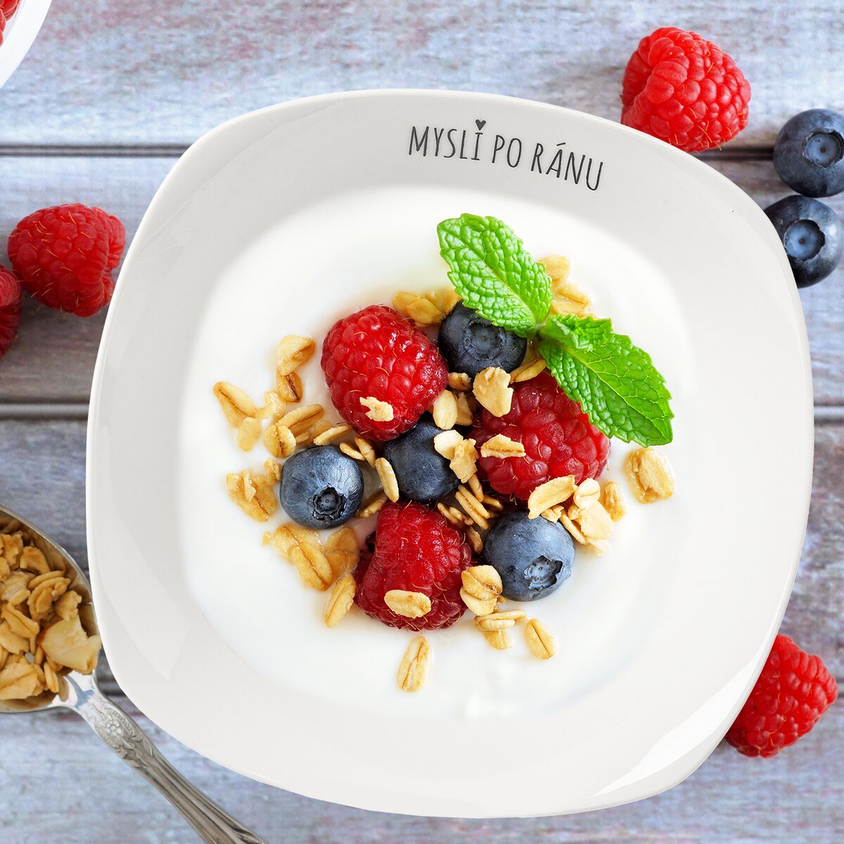 Porcelánová miska na vydatnou snídani, která Vás nastartuje na celý den. Jogurt s müsli, domácí granolu, chia pudink s ovocem, snídaňové cereálie i svěží ovocný či zeleninový salát můžete servírovat v hranaté bílé misce s nápisem "Mysli po ránu". Vykročte do nového dne s plným bříškem a dobrou náladou.