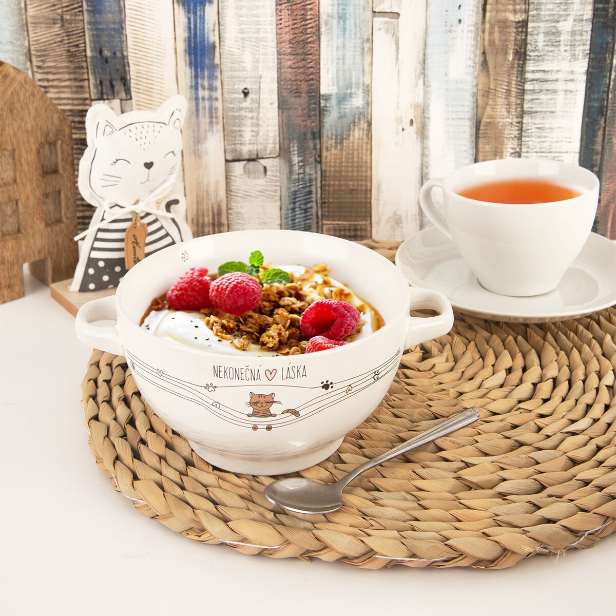 Kód produktu 129204Keramická polévková miska o objemu 0,73 l a dvěma uchy zaujme nápisem NEKONEČNÁ LÁSKA a motivem kočičky.
