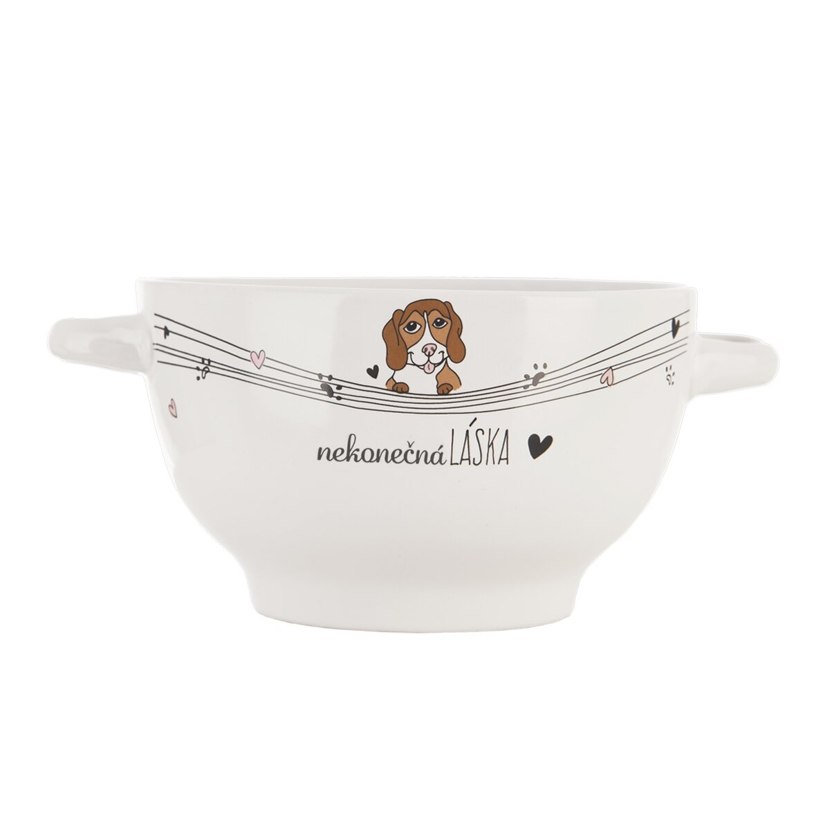 Kód produktu 129205Keramická polévková miska o objemu 0,73 l a dvěma uchy zaujme nápisem NEKONEČNÁ LÁSKA a motivem pejska.