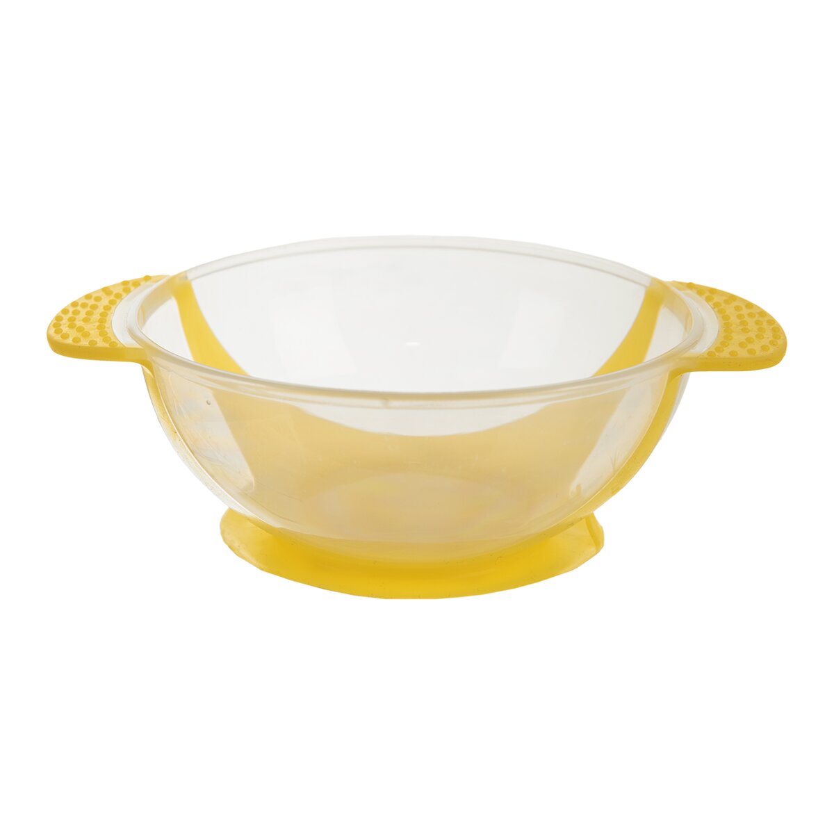 Kód produktu 129802Dětská miska s přísavkou na svačiny a přesnídávky, vyrobená z transparentního plastu se žlutými prvky, bez obsahu BPA. Je opatřena dvěma uchy a praktickou gumovou přísavkou.