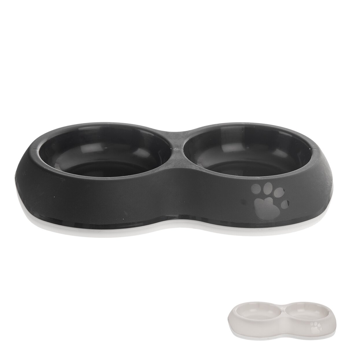 Dvojitá miska pro psy a kočky, kterou ocení zejména chovatelé malých plemen. Je vyrobena z plastu a v dolní části má pás z termoplastické gumy, aby při krmení tolik neklouzala po hladké podlaze.