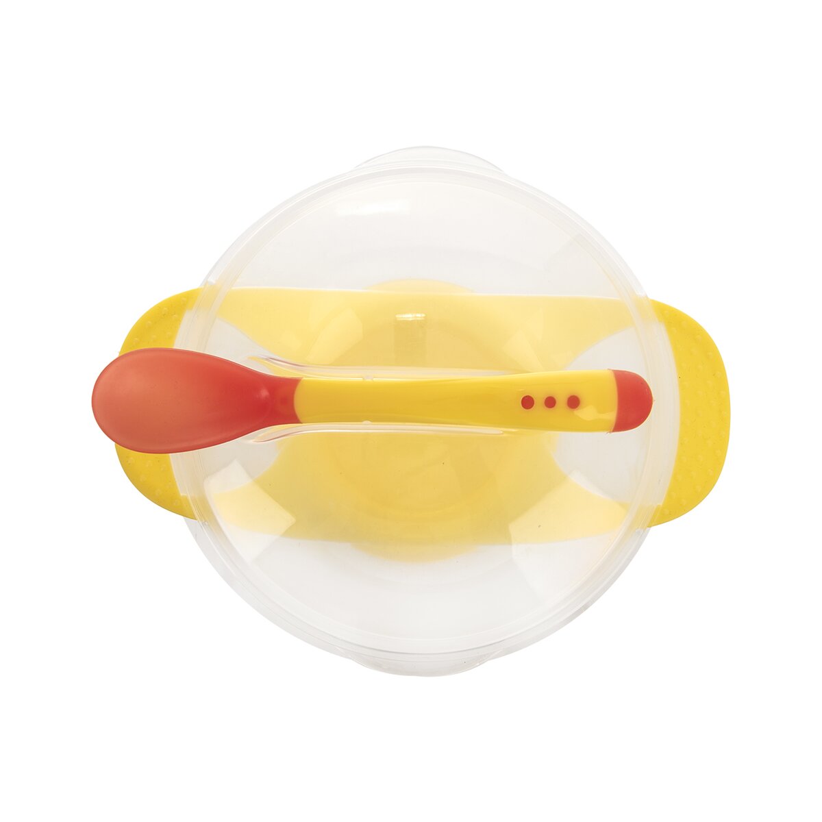 Kód produktu 129804Dětská miska s víčkem, lžičkou a s přísavkou na svačiny a přesnídávky, vyrobená z transparentního plastu se žlutými prvky, bez obsahu BPA. Je doplněna dvěma uchy, víčkem, lžičkou a ve spodní části opatřena gumovou přísavkou.