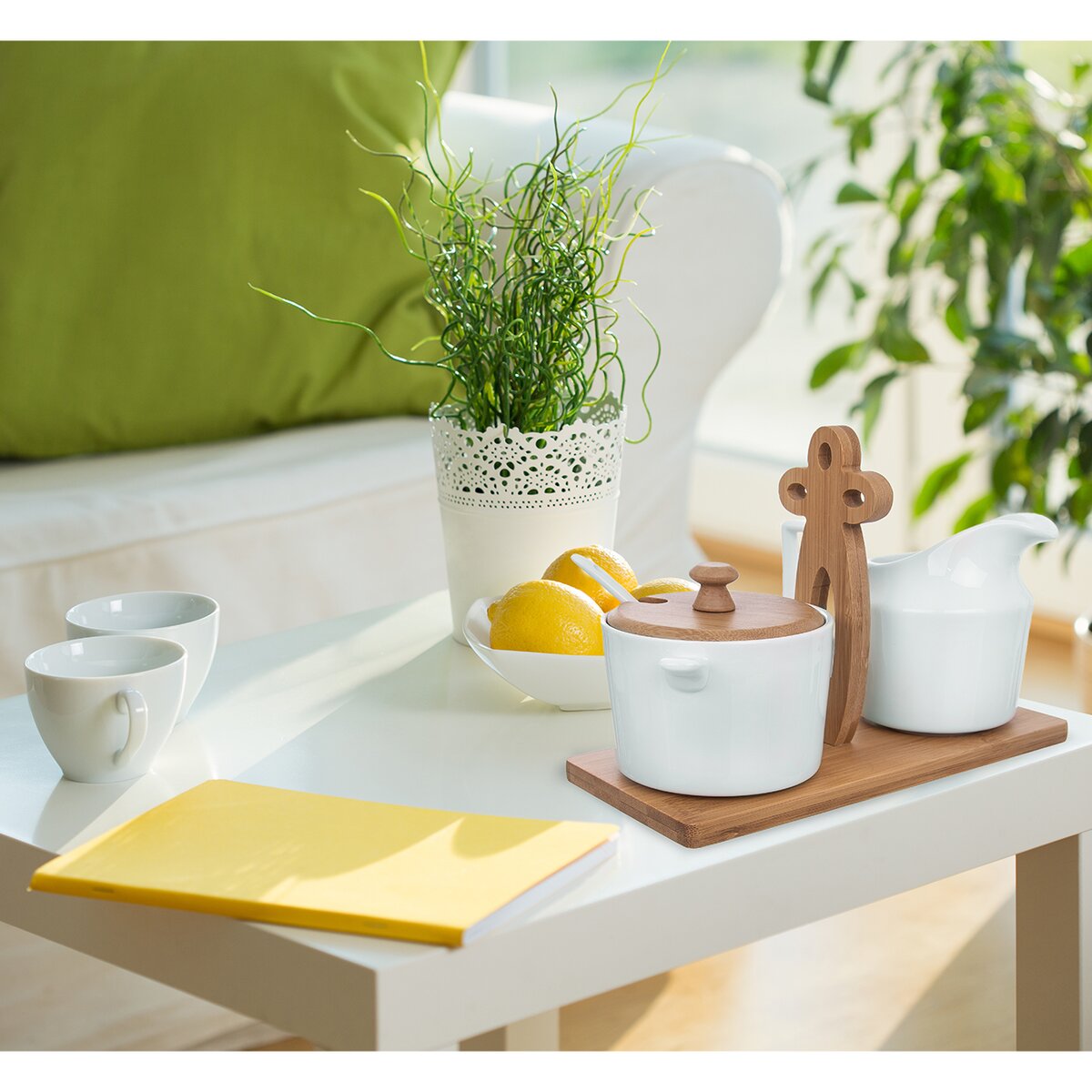 Krásně vypadající porcelánová mlékovka a cukřenka s vloženou lžičkou a bambusovým víčkem. Obě nádoby o objemu 0,28 l jsou usazeny v bambusovém stojanu s dekorativním držadlem.