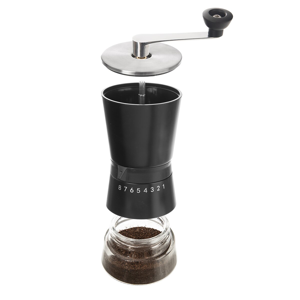 Kód produktu 130231Mechanický nerezový mlýnek na kávu v moderním provedení, s černým tělem a spodní skleněnou nádobou, pro ruční mletí zrnkové kávy pomocí keramického mlecího mechanismu.