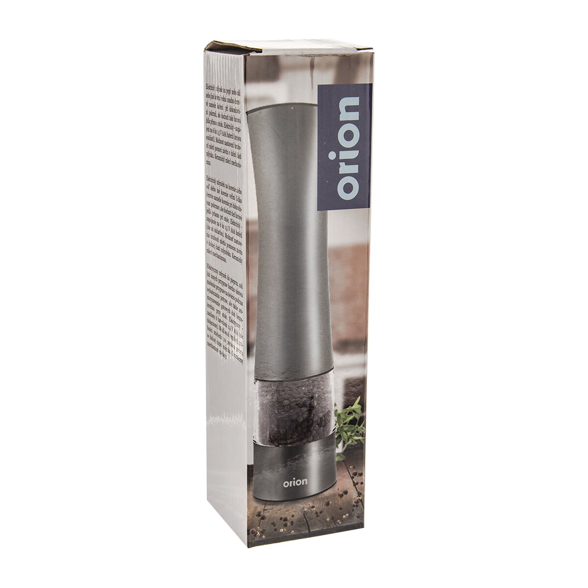 Kód produktu 130224Elegantní nerezový elektrický mlýnek na koření napájený 1,5 V AAA bateriemi, určený k dochucení pokrmů solí, pepřem nebo jiným kořením. Má keramický mlecí mechanismus a transparentní část ukazující, zda je třeba koření znovu doplnit.