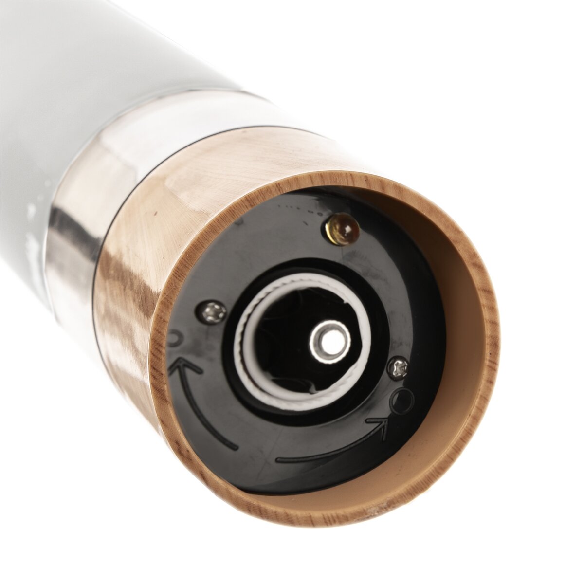 Nastavení hrubosti mletí od jemného mletí pepře do polévek až po hrubě drcený pepř na steaky je umožněn pomocí otáčení matice v dolní části mlýnku, a to ve směru šipek. Napájení na 4 ks 1,5 V AA baterií (nejsou součástí). Je vyrobený z plastu ABS a AS.