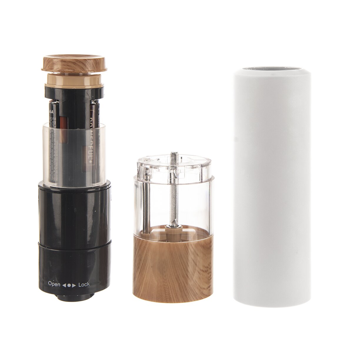 Kód produktu 130232Elegantní elektrický mlýnek na koření v kombinaci bílé barvy a plastových prvků v imitaci dřeva. Je napájený 1,5 V AA bateriemi a určený k dochucení pokrmů solí, pepřem nebo jiným kořením. Má keramický mlecí mechanismus a LED osvětlení.