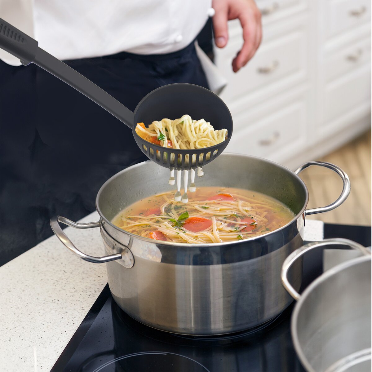 Více informacíUž jste se určitě někdy setkali s požadavkem hostů nebo členů rodiny, že by rádi hustější nudlovou polévku. Výborným řešením je naběračka s podélnými otvory na jedné straně, která slouží jako cedník. Snadno naberete porci polévky a ještě docedíte nudle, kápání či jinou zavářku do polévky, játrové knedlíčky a zeleninu tak, aby byli strávníci spokojeni.